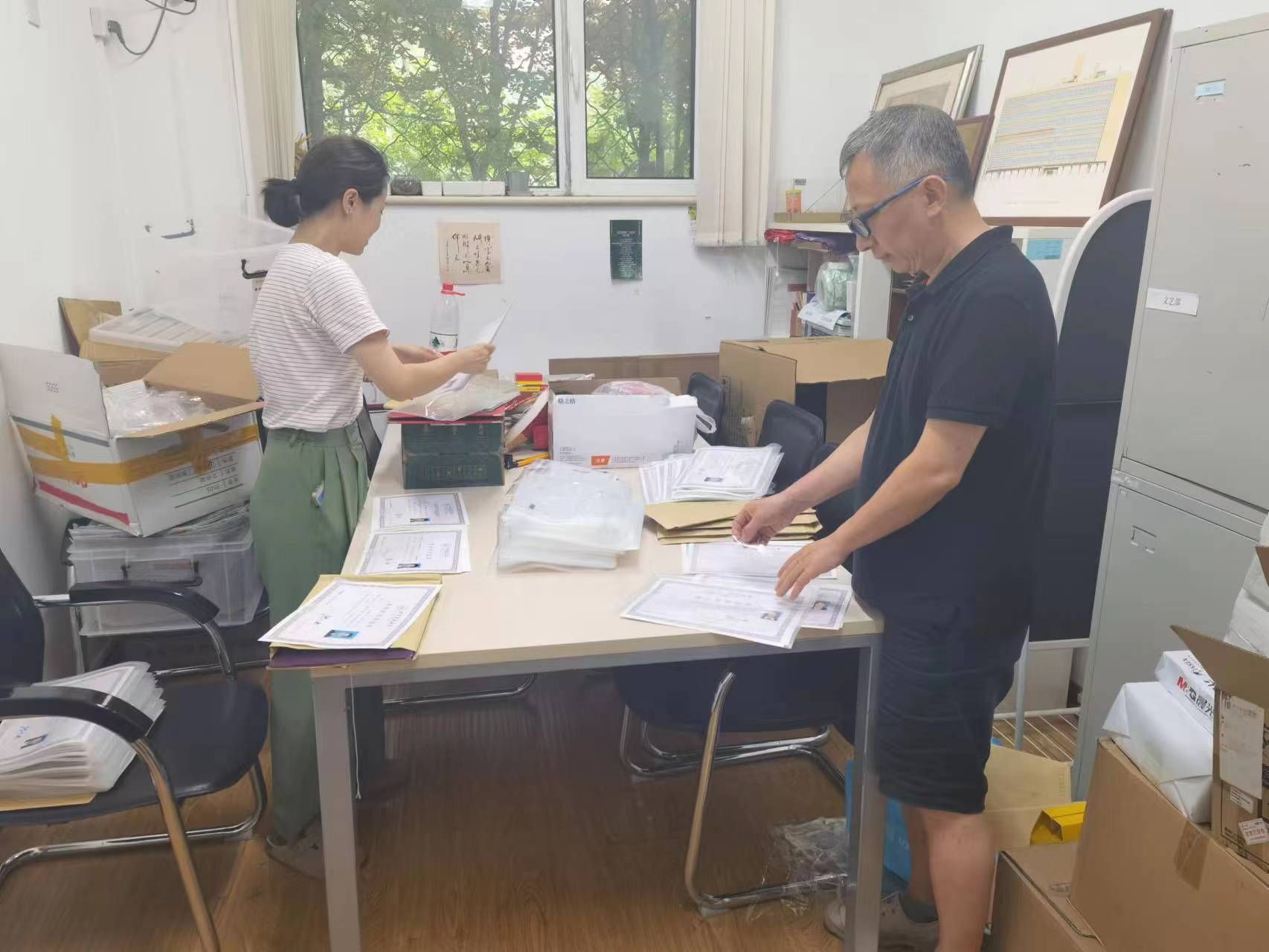 威廉体育williamhill教学管理办公室王宇石老师连续多日投入相关工作,核对毕业生信息、打印成绩单、张贴毕业证、学位证照片。6月21日中午,教学管理办公室刘志刚、王宇石、黄庭晚三位老师赴大兴校区教务处完成毕业证、学位证盖章工作,之后赶回西城校区分装材料。当晚所有毕业生的证书等相关材料由学院采用快递寄出。