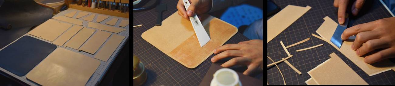 按照纸样在皮上描出样子,然后用裁皮刀按照样子裁下来。下料的时候要注意充分利用皮料,尽量躲开皮表面的缺陷并尽量节省用料。