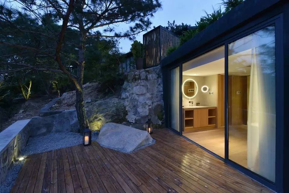 In the design of Nashare Hotel, we painted the exposed facade with dark gray. Normal container has very bright color and industrial feeling. But apparently it does not consist with the quality of natural environment. Also, not like black, dark gray does not have absolute purity. It can reflect the nuanced change of shadow casting from the tree and daylight. And it is a color makes people feel quiet. The most important idea is that it can make the architecture back into the mountains and shadows without feeling abrupt. On the contrast, the interior of the architecture uses large amount of wood to create a comfortable atmosphere. During the night, the warm light become obvious and the architecture hides into the surrounding trees and shadows.