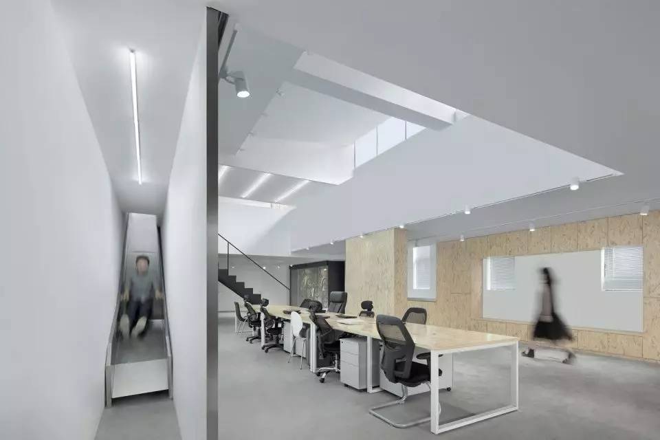 此外,C+ Architects的项目很多家具会是特殊设计。在竞园22号楼改造项目中,除了选用奥松板打造更加生态环保的家具外,我们还将一个可以直达洗手间的滑梯和家具组合到一起,做完之后大家都非常喜欢。很多人来我事务所应聘都是因为那个滑梯,他们看到这个滑梯,认为我们是一个特别有趣、轻松的事务所,最后来了发现被骗了,我其实是一个特别严肃的人。