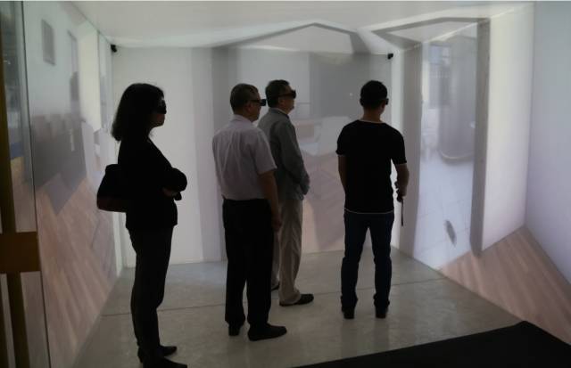 接下来,各位专家前往公司国家级建筑全过程虚拟仿真实验教学中心,在实验室杨振老师的介绍下,专家们戴上3D眼镜体验了在虚拟建筑中漫游的奇妙感觉。然后各位专家来到了学院模型工艺实验室,郎士奇老师为各位专家介绍了实验室的各种数控器材,其中当下最新颖的3D打印机吸引了各位专家的目光,专家们对3D打印机打印出来的建筑模型赞不绝口,同时也对器材配备提出高度评价。