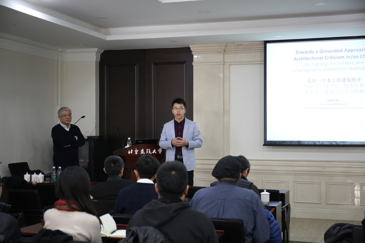 2017年11月27日下午,墨尔本大学设计学院朱剑飞教授到访威廉希尔体育,并在西城校区教1-126举办题为“走向一种本土的建筑批评:何镜堂、设计院、地缘关系和个人与集体的混合动力”(Towards a Grounded Approach in Architectural Criticism: He Jingtang, the Design Institute and a Cartographic-Institutional Methodology)的学术讲座。讲座由公司青年教师丁光辉主持,威廉体育williamhill副经理胡雪松教授、王韬老师,部分研究生本科生,一些校外专家学者和建筑师出席、讨论。