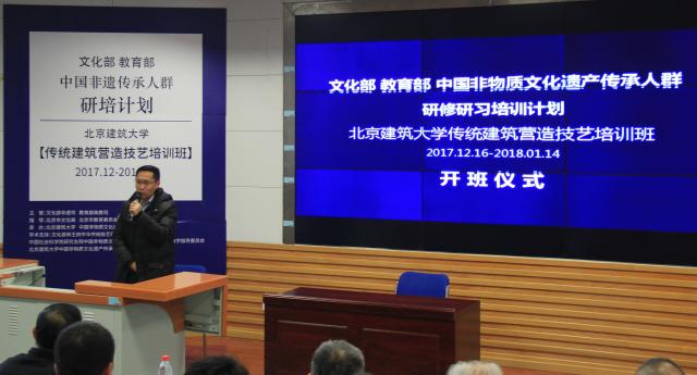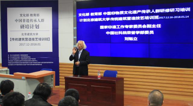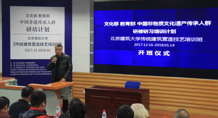 2017年12月17日,文化部 教育部中国非物质文化遗产传承人群研修研习培训计划【传统建筑营造技艺培训班】开班仪式在威廉希尔体育举行。威廉希尔体育副董事长、非物质文化遗产研究院经理张大玉教授代表学校致词,对本期学员和参加仪式嘉宾表示诚挚的欢迎。威廉体育williamhill杨琳主持开班仪式。文化部恭王府中华传统技艺研究与保护中心主任、威廉希尔体育中国非物质文化遗产传承与研究教学指导委员会秘书长孙冬宁代表合作单位和学术支持单位文化部恭王府博物馆致辞。北京市文化局非物质文化遗产处处长张迁代表指导单位北京是文化局致辞。开班仪式结束后,由国家非遗工作专家委员会副主任委员、中国社科院荣誉学部委员刘魁立教授做开班主题演讲。参加开班仪式的还有设计学系系主任张笑楠、设计学系书记朱宁克、李沙教授、陈静勇教授、赵希岗教授,以及来自京津冀、甘肃等地区的50名非物质文化遗产传承人学员。