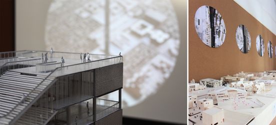 首届“城市设计实验班”三年级教学成果展评现场(左)和“旧城拾忆”地段模型(右)