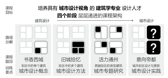 本届城市设计实验班采用了全新的独立培养方案,在大一的建筑初步和大二的建筑基本知识学习的基础上,于三年级全面展开“城市设计”专业课程。教学团队提出了三年级“四步走”的课程设计思路,引导员工通过4个设计由建筑思维逐步向城市思维转换,进而在大三年级掌握城市设计的基本概念、设计视角以及研究方法。