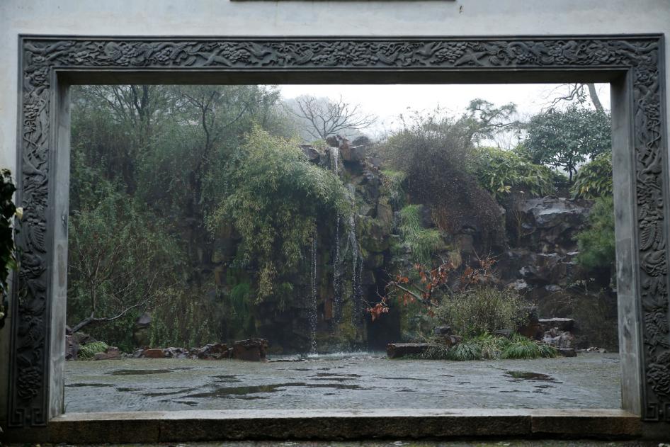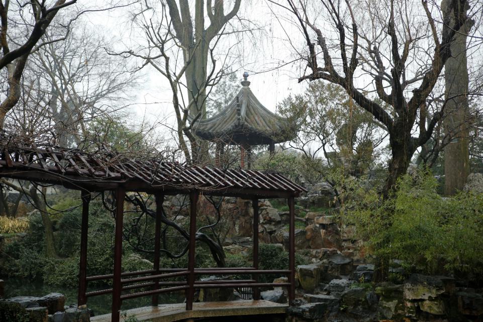 苏州园林里还有一点颇有意趣,在不少的园林之中,往往有着一处院子,一个屋子,其间陈列的不是刻画精细的家具或是制作精良的器皿,而是一盆盆的盆栽。盆栽此物,有假石有假山,细节之处无一不刻画得精细,植物更是修剪的颇有意趣。但是,在一处有着实景实物的园林之中为何要追求这种细化的微观之物?我想我从园林之中找到了答案。除了细微之处精工的雕刻,院中拐角的一颗盛放之树,精雕的木窗外一抹盛放的腊梅,在意趣横生的建筑拐角的一只独自盛放的花,屋檐下一支沾满了露水的枝头,一帧帧景色也塑造了苏州园林一种片段美,这在我看来也是苏州园林意趣中独有的一部分。
