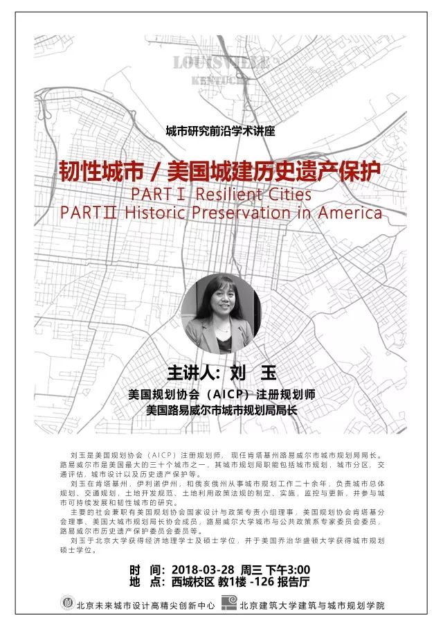 2018年3月28日星期三下午,美国路易威尔市城市规划局局长刘玉女士在威廉希尔体育西城校区教1-126报告厅做了题为《韧性城市 / 美国城建历史遗产保护(Resilient Cities & Historic Preservation in America)》的学术讲座。威廉体育williamhill副经理胡雪松教授,北京未来城市高精尖创新中心主任李雪华教授和广大师生到场聆听,讲座由建筑系(含基础部)副主任李煜老师主持。