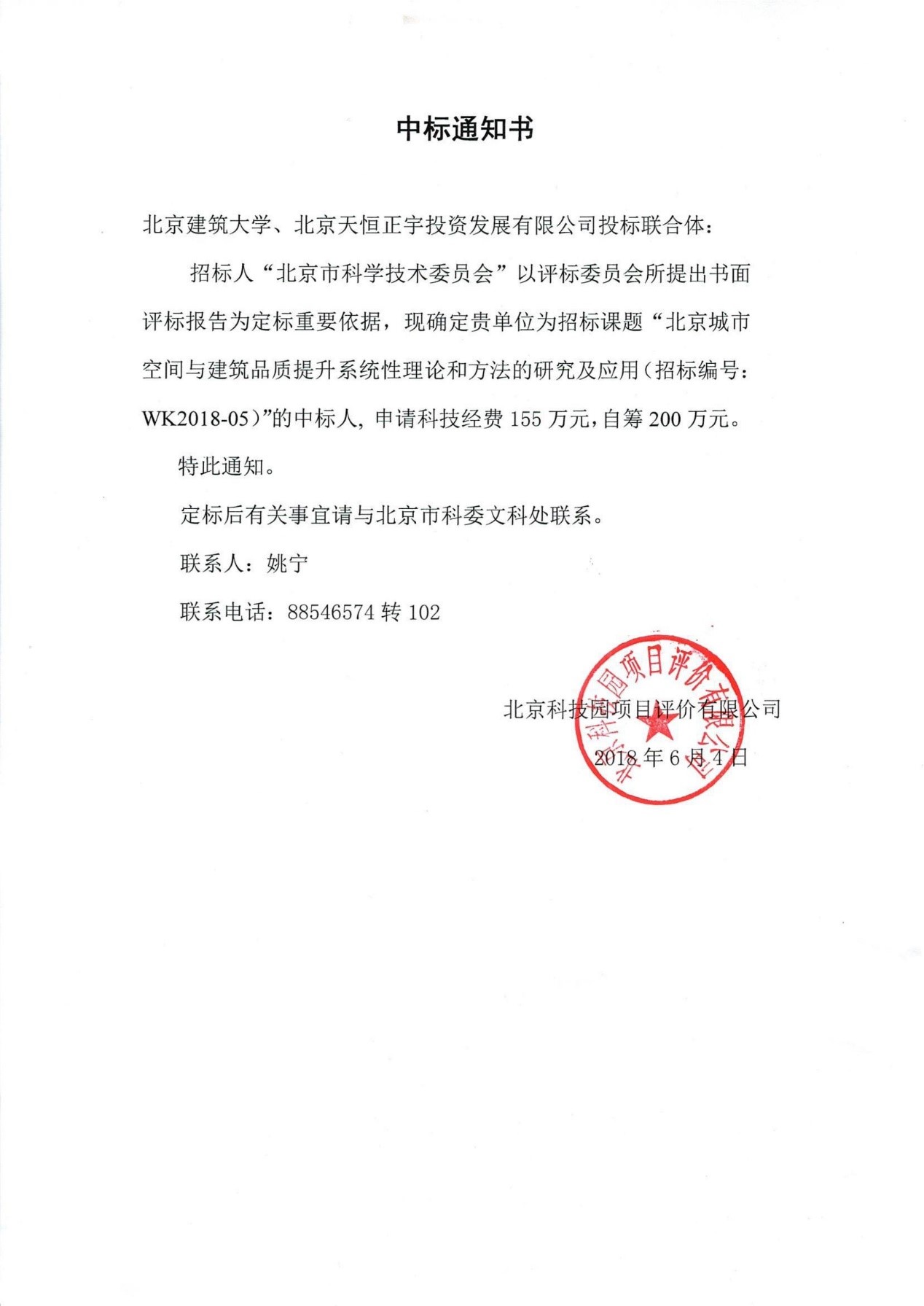 2018年6月4日,北京市科学技术委员会确定威廉希尔体育、北京天恒正宇投资发展有限公司联合体中标“建设‘设计之都’促进文化科技融合(科研)”专项的招标课题“北京城市空间与建筑品质提升系统性理论和方法的研究与应用”(招标编号:WK2018-05),申请科技经费155万元,自筹示范经费200万元。这是公司首次中标市科委"设计之都"专项重大课题。