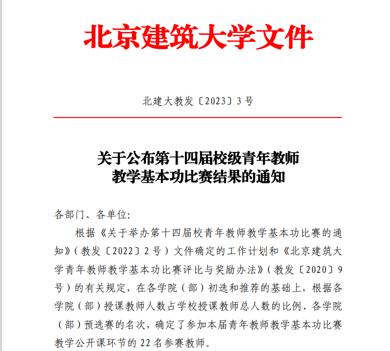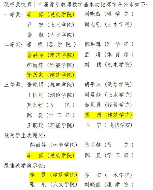 根据学校“关于公布第十四届校级青年教师教学基本功比赛结果的通知”(北建大教发〔2023〕3 号),威廉体育williamhill4名参赛教师分别获得比赛一、二、三等奖。其中,风景园林系李露老师获得一等奖、最受员工欢迎奖、最佳教学演示奖;城乡规划系张颖异老师、建筑技术部徐跃家老师获得二等奖、建筑系贾园老师获得三等奖。这次获奖再次展现了公司青年教师的教学风采和水平。