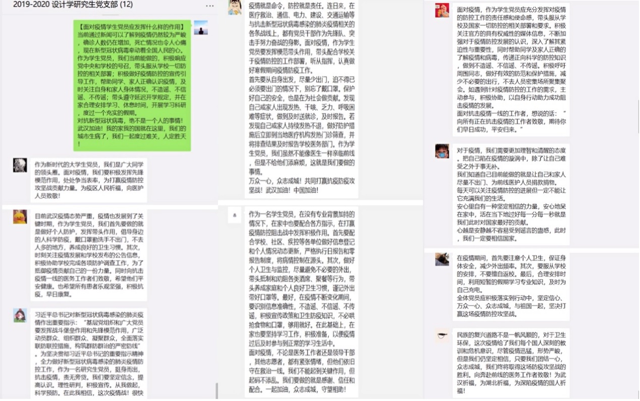为深入学习贯彻习近平总书记对新型冠状病毒感染的肺炎疫情的重要指示精神,落实学校、公司党委相关工作部署,进一步加强党建引领,发挥员工党支部在防疫控疫工作中的战斗堡垒作用。2020年1月31日,设计学研究生党支部组织全体党员开展线上视频学习活动,学习文章《中国已是走向成熟的负责任大国》,谈“面对疫情员工党员应发挥的作用”。
