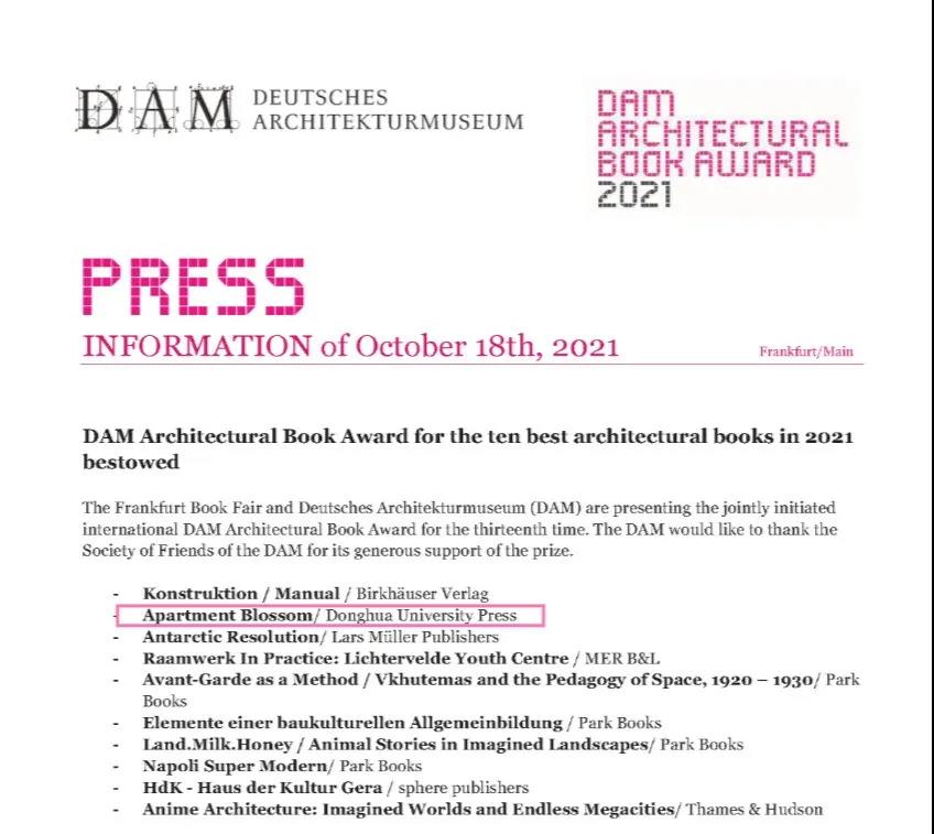 德国十佳建筑图书奖由法兰克福书展(Frankfurt Book Fair)和德国建筑博物馆(DAM)发起,颁予年度最佳建筑类图书,此奖项因其独一性受到广泛认可。今年来自世界各地的93家建筑和艺术图书出版商共计235本出版物参与角逐。由外部专家和DAM代表组成的评委会根据设计、内容、材料质量、创新和话题性等标准选出了最佳的10本图书。评审会议于2021年9月1日在德国建筑博物馆(DAM)举行。