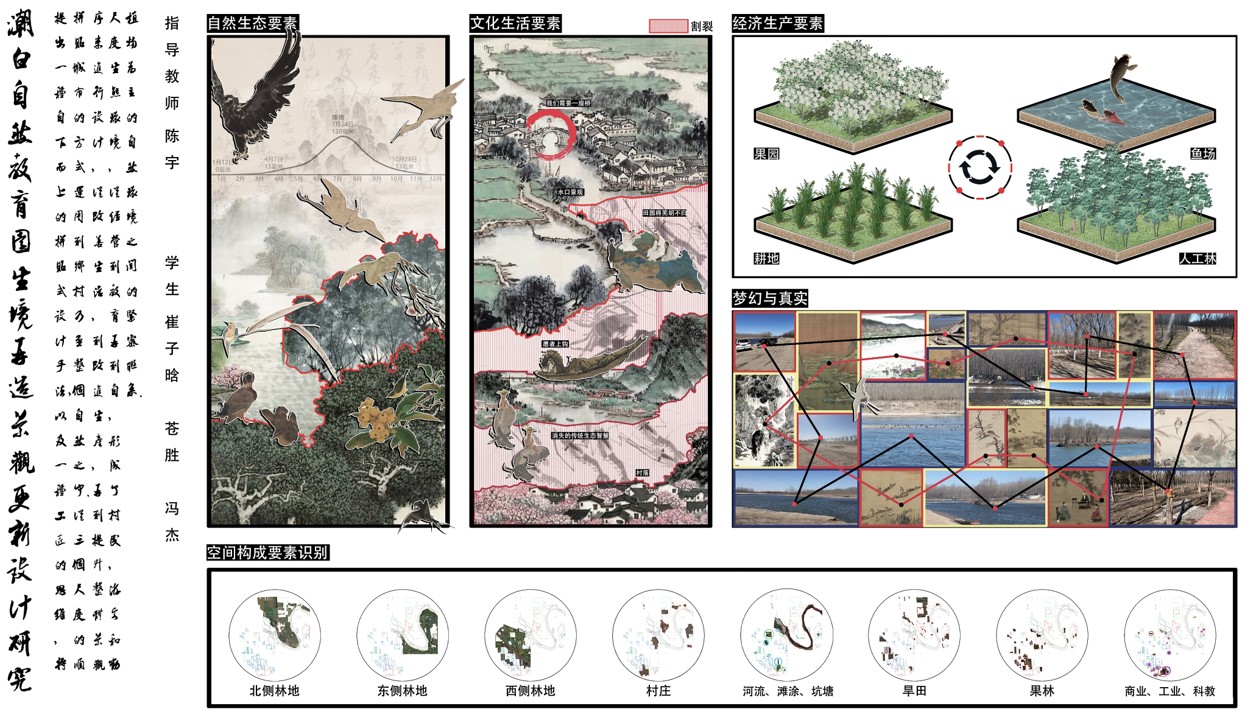 河北工程大学组《久在樊笼里,复得返自然》用“久在樊笼里,复得返自然”表现久处城市中的人们对自然的向往和本真追求。将诗中所展现的意境与设计目标愿景融合,从生态基底更新、历史文化赓续、智慧乡村构建,来打造人与自然的纽带,并在游览体验、生态、文化、科技四个方面起到自然教育的作用。