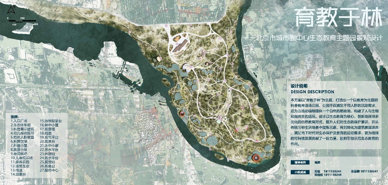 天津美术学院组《育教于林》希望打造出一个以教育为主题的科普教育湿地公园,公园不仅满足不同人群的活动需求,还为当地动植物提供一个自然的栖息地,构建人与生物和谐共生的场所。设计以生态教育为核心,创新地探寻多元化的自然教育形式,提升人们的生态保护意识,并从传统习俗和当地生活场景中提炼元素,将其转化为建筑景观语言,满足当下时代对生态保护及自然科普教育的迫切需求,更为地球的可持续发展贡献了一份力量,起到引领示范生态教育的作用。