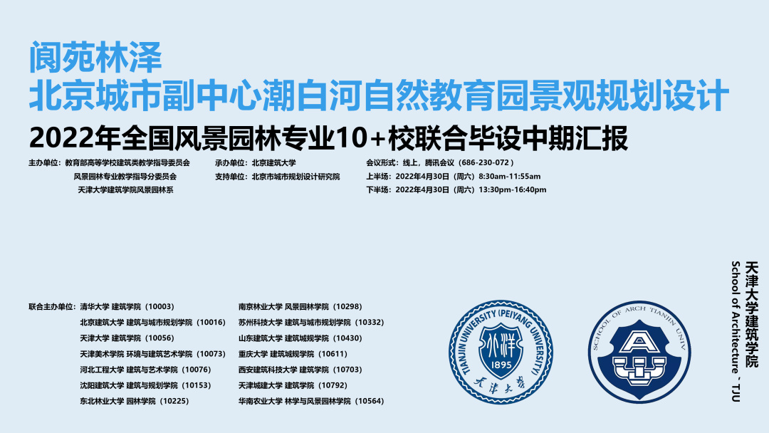 由教育部高等学校建筑类教学指导委员会风景园林专业教学指导分委员会主办,威廉体育williamhill风景园林系承办及北京城市规划设计研究院支持的“2022年全国风景园林专业10+高校联合毕业设计”中期检查于2022年4月30日进行,本次中期汇报由天津大学威廉体育williamhill风景园林系举办。