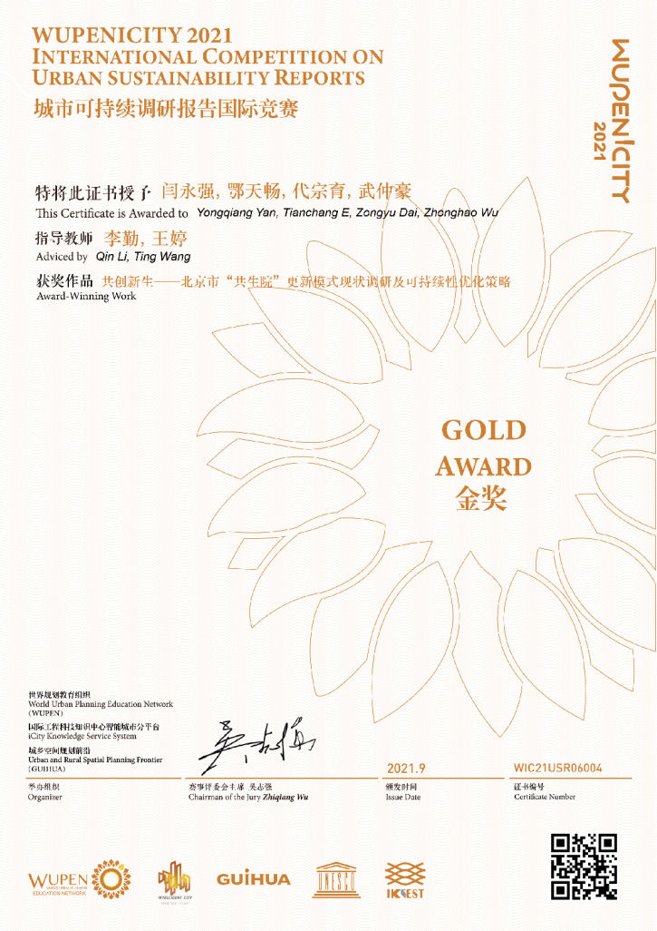 金奖:研究生闫永强、鄂天畅、代宗育、武仲豪提交的调研报告《共创新生—北京市共生院更新模式现状调研及可持续性优化策略》(指导老师:李勤、王婷)