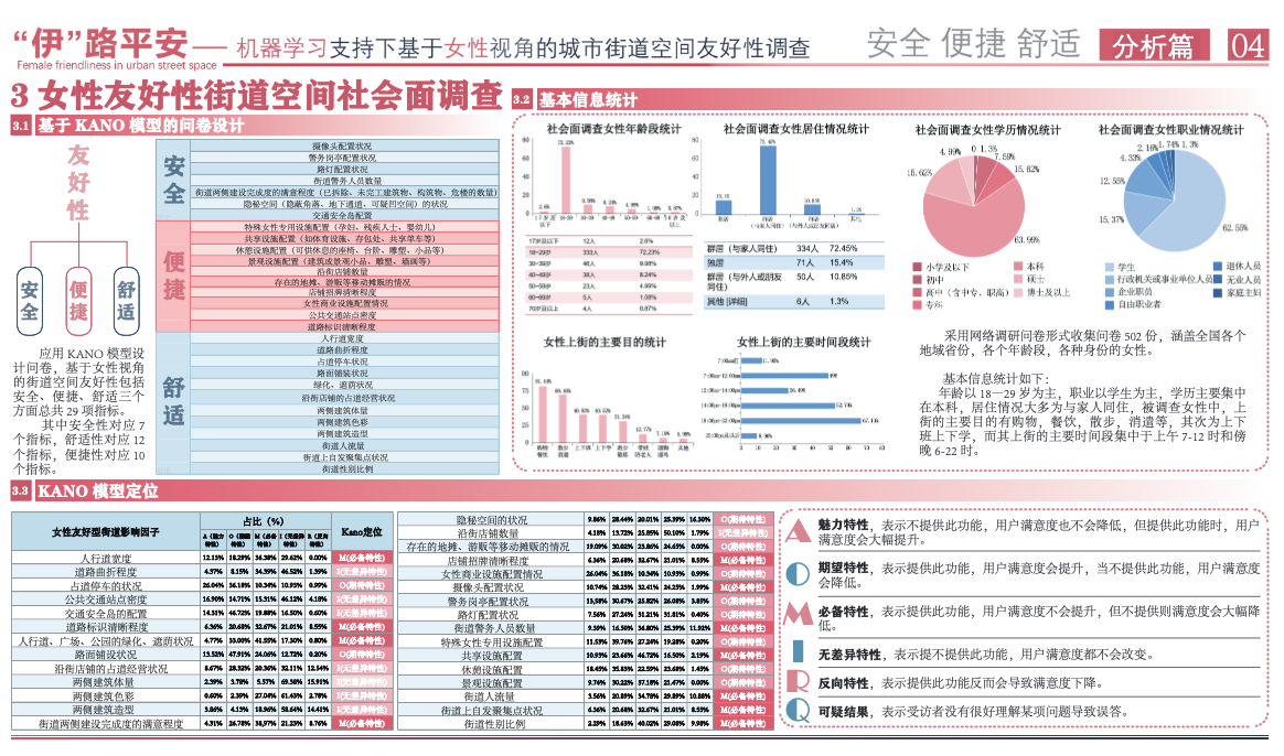 二等奖:本科生康牧铧、慕希雅、王研、李博涵提交的调研报告《“伊”路平安—机器学习支持下基于女性视角的城市街道空间友好性调查》(指导老师:杨震、李勤、吕小勇)