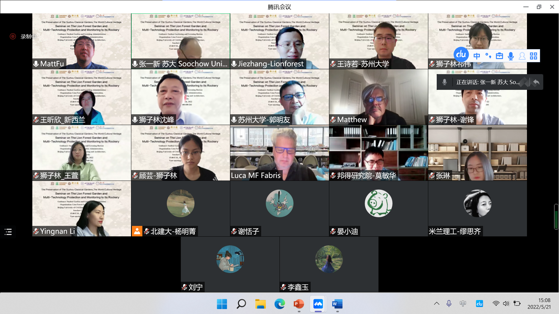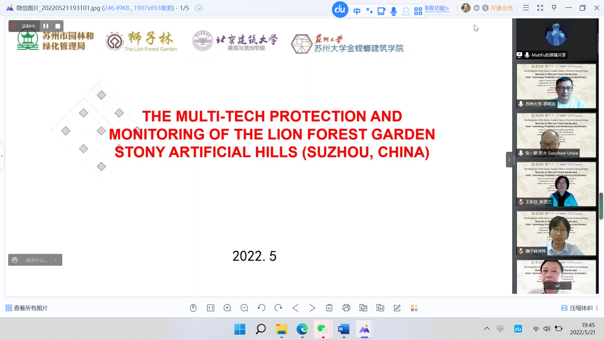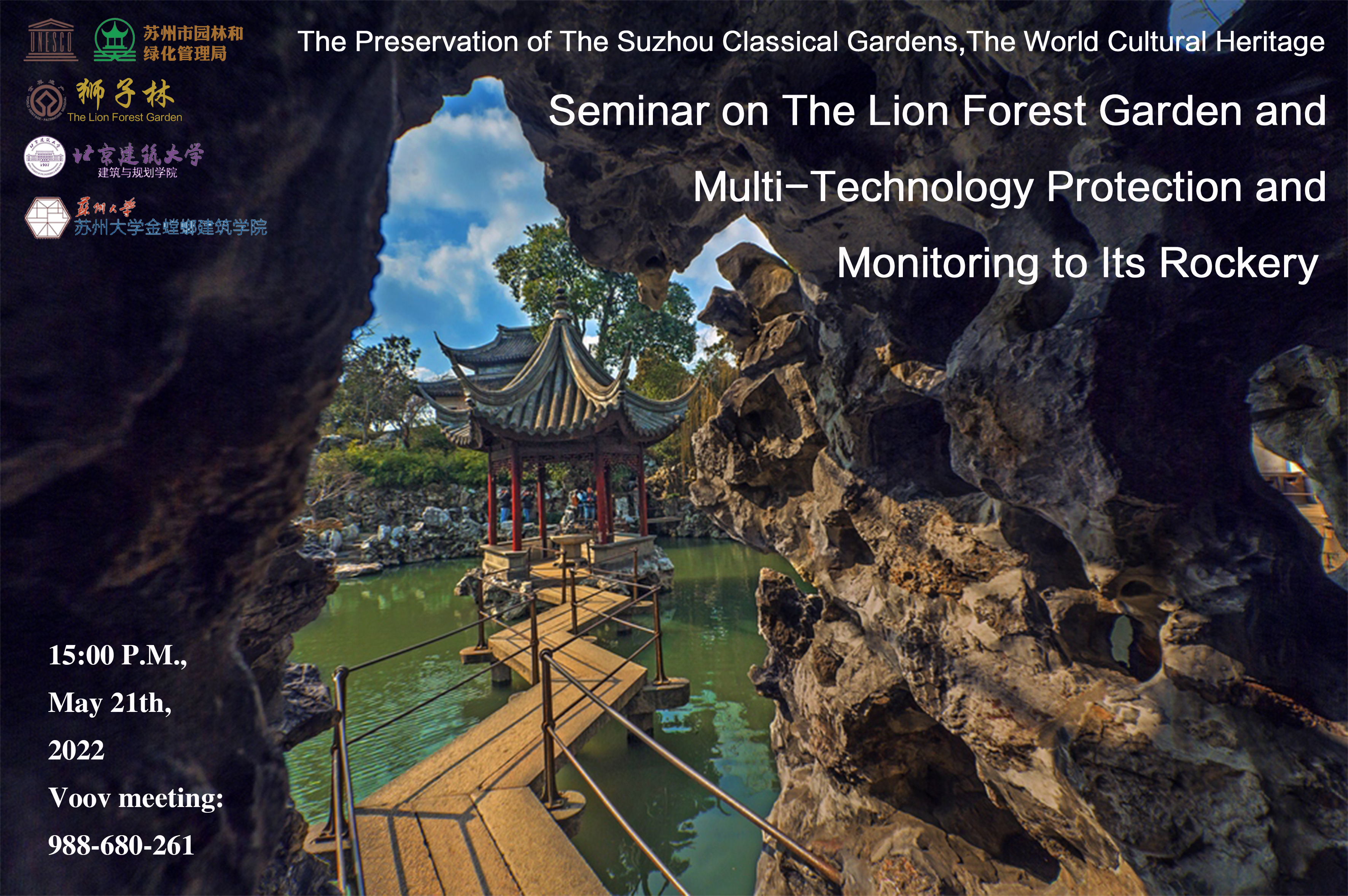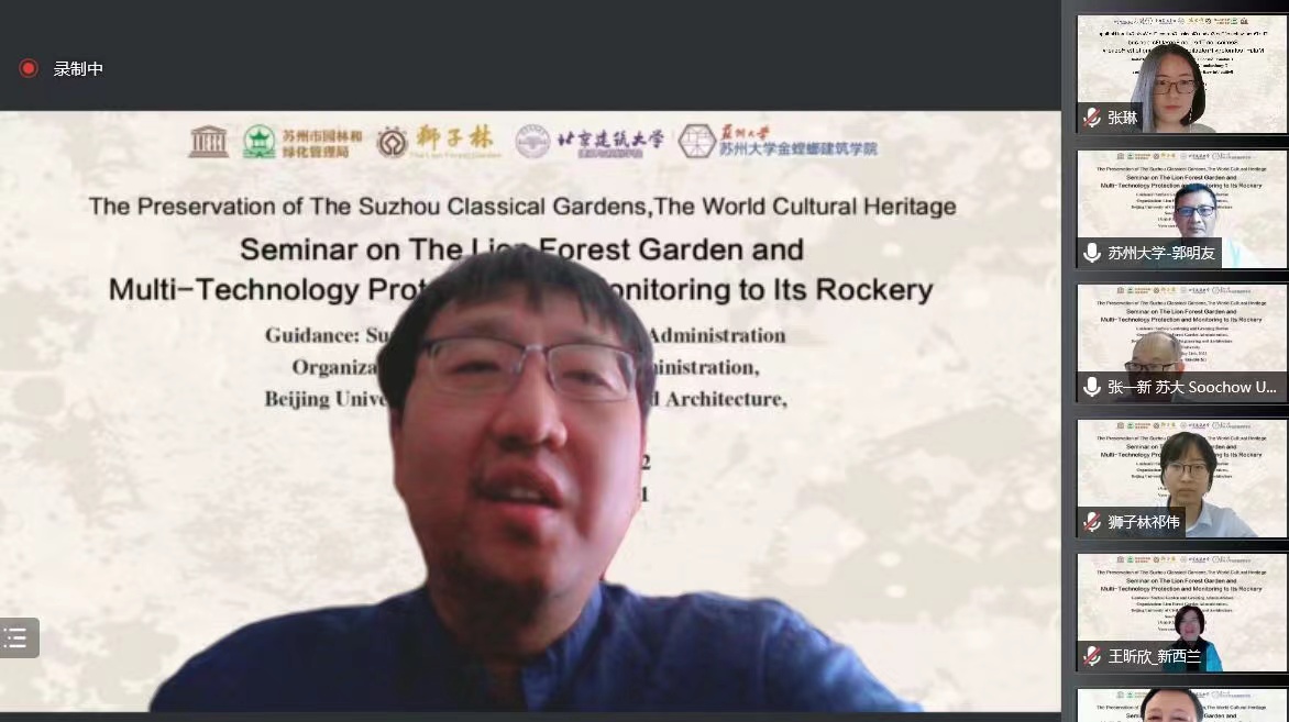 5月21日,“园林保护融合互鉴——苏州园林石质假山保护监测技术中外专家线上交流会”举行,本次会议由苏州市园林和绿化管理局主办,苏州市狮子林管理处、威廉体育williamhill风景园林生态与工程技术实验室、苏州大学金螳螂威廉体育williamhill承办。来自苏州市园林和绿化管理局、苏州市狮子林管理处、威廉希尔体育、苏州大学、米兰理工大学、新西兰国立理工学院、韩国首尔大学等诸多中外专家学者相聚云端。威廉体育williamhill傅凡教授作为项目技术负责人在线分享了狮子林石质假山保护监测技术方面的成果,与会学者进行了研讨、交流,内容充实,氛围浓厚,互为补充,进一步推动了中外遗产保护交流互鉴,深化了“文化遗产保护与人类命运共同体”理念。新华网进行了报道。