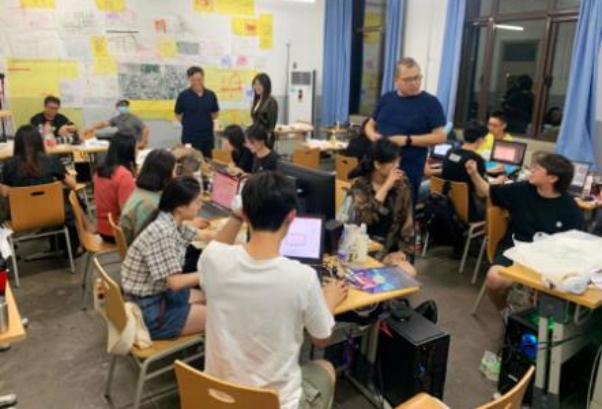 工作营自7月26日在腾讯北京总部开营至今,历时13天,共包括专题讲座、场地调研与Toolbox建立、Toolbox测试与快速设计、最终设计与成果表达等四个教学模块。工作营开营之初,联合教学团队分别为同学们提供了9场包括自动驾驶、数字孪生、现实增强、智慧城市等领域的专题讲座,之后通过对金科新区核心区的实地调研,以问题导向开展了“校区+园区+社区”融合快速设计,并分A、B两组,以“智慧新区——数字引领城市公共空间转型升级”和“边界·融合·赋能·更新”为主题完成了自动驾驶技术驱动下的金科新区核心区城市更新设计。