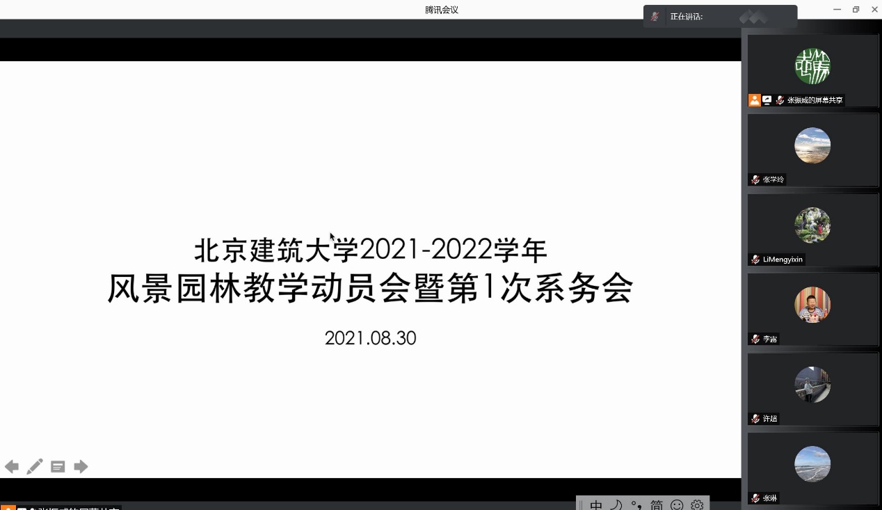 开学在即,2021年8月30日(周一)下午13:00,风景园林系组织召开了《威廉希尔体育2021-2022学年风景园林教学动员会暨第一次系务会》。会议采取腾讯线上方式举行,系部全体教师出席了本次会议。会议由风景园林系主任张振威主持,会议内容主要围绕开学前准备工作、本学期重要事项及设计课课题基本情况进行沟通和交流。