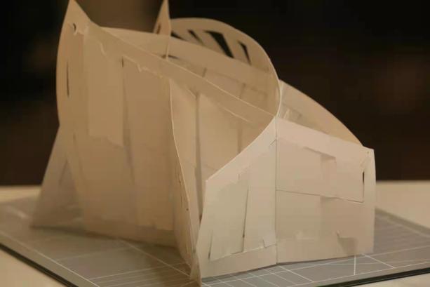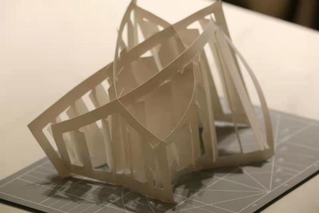 设计说明:此次营造的空间由四片相同的直角梯形纸片组成,通过两种刀口嵌插的方式连接而成的瓣状围合空间。入口由两片上瓣围合,每面纸片上都刻出了等宽的长条矩形开洞,可进行135度左右正逆时针的旋转,同时长条开洞和上下开洞的交替插入,对开洞的方式也进行了进一步的丰富。四片直角梯形纸片不同的朝向和摆放方式为空间创造了起伏感,也利用高度的差异引导分隔空间中的走向。