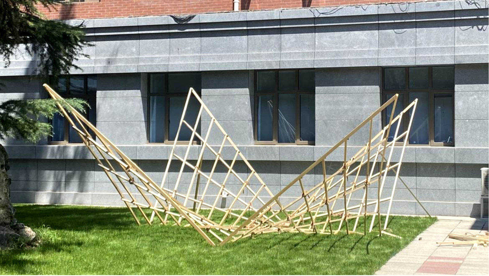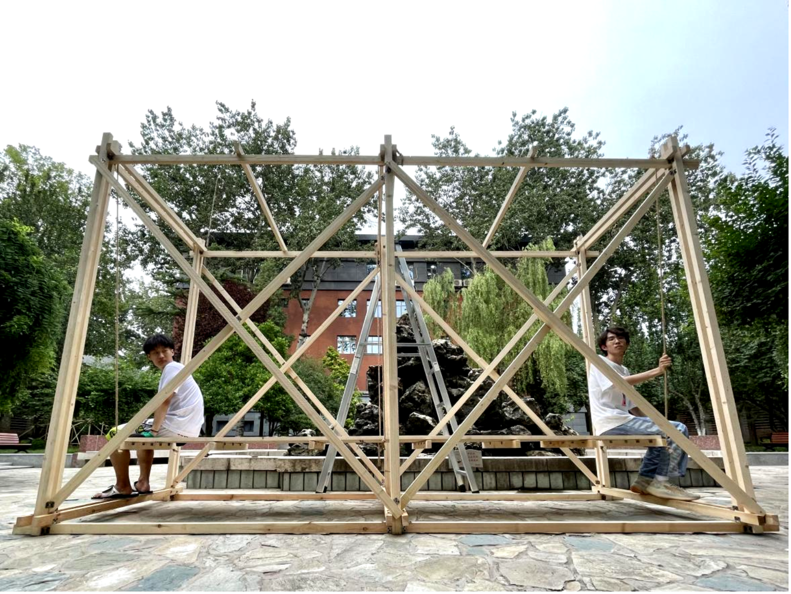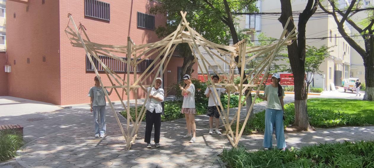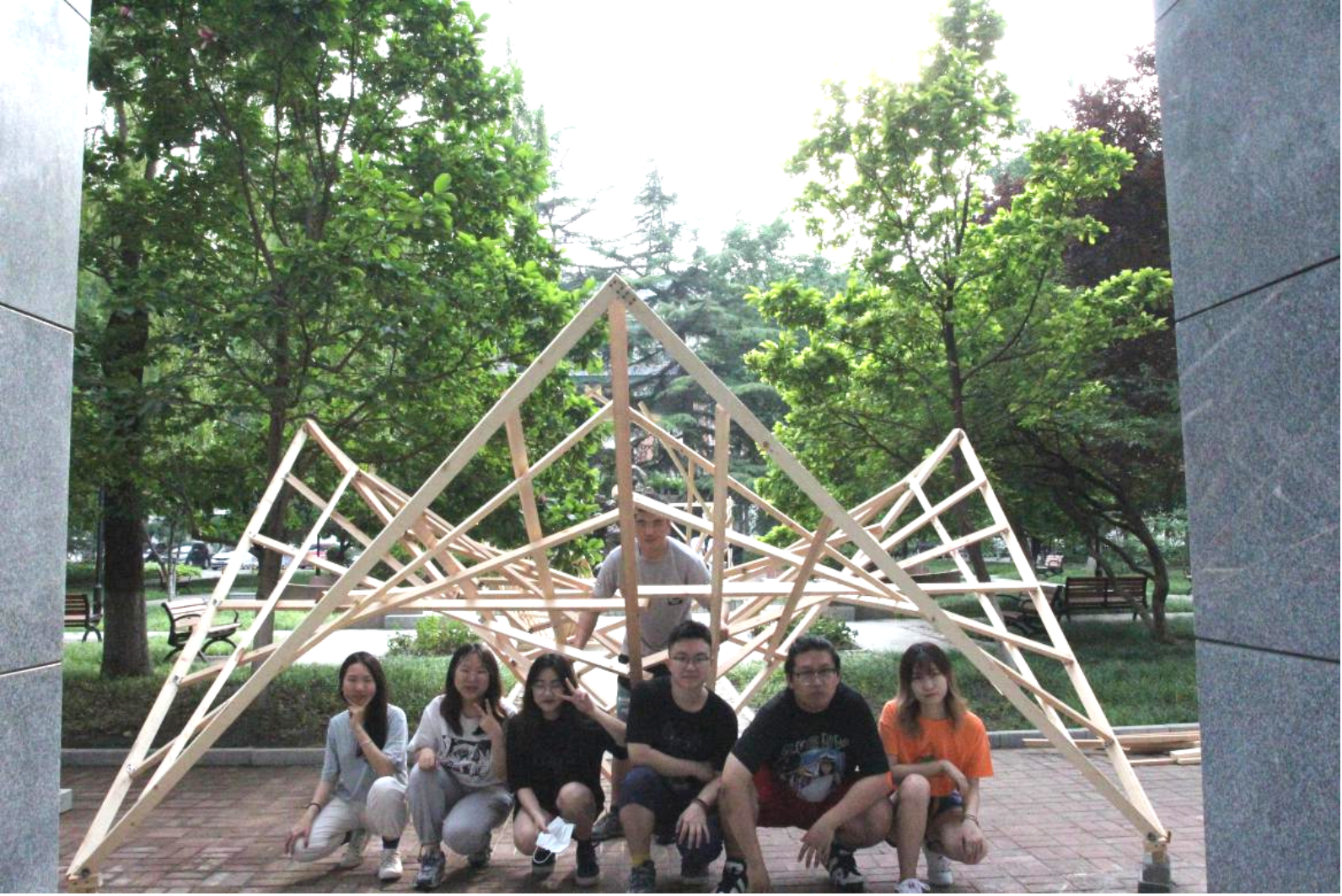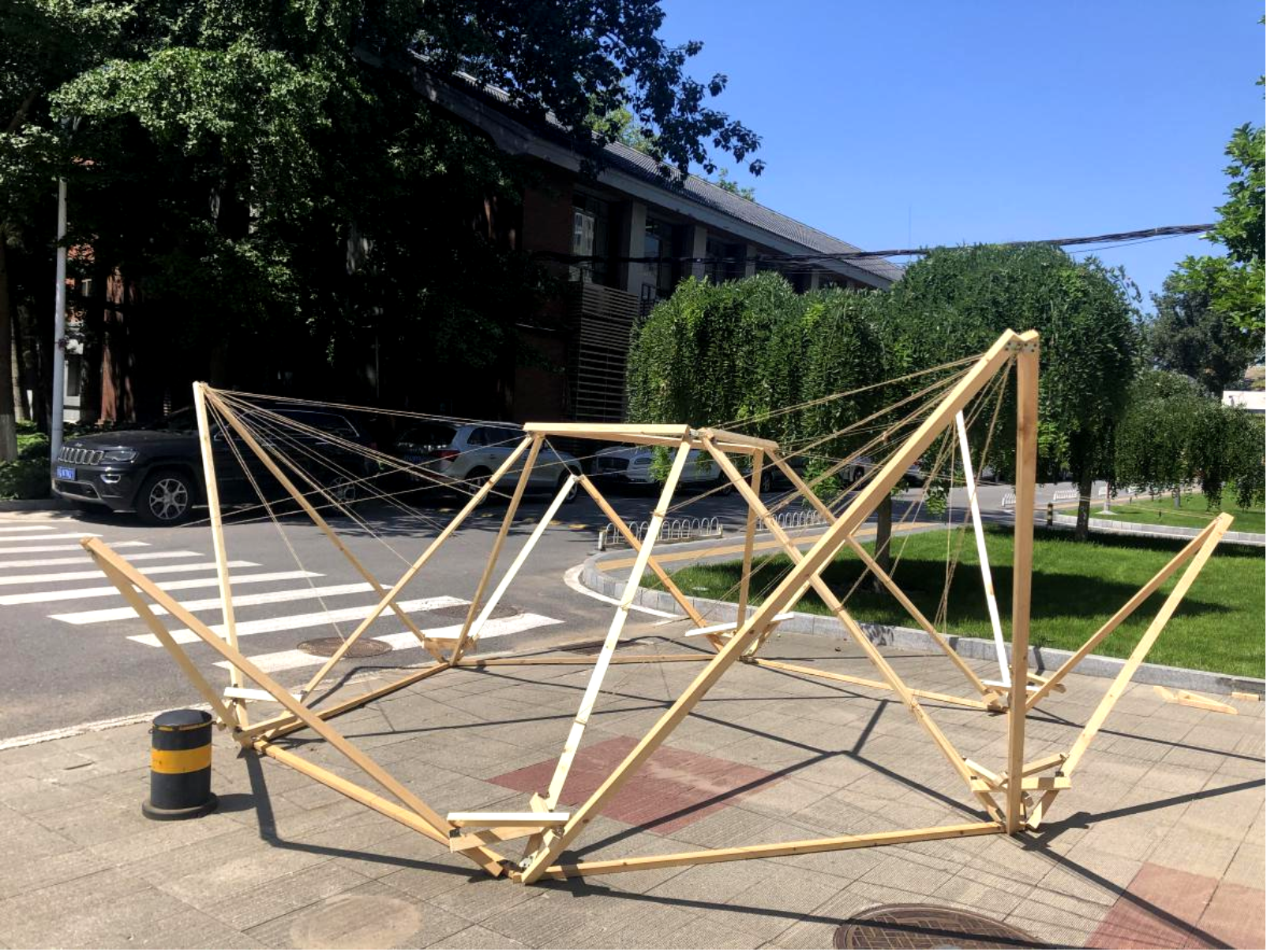 实习周具体实习任务为制作大尺度杆、曲面、组合结构模型,可以是高耸结构体系(要求占地≥1m2,高≥4m)或者大跨结构体系(要求占地≥5m2,跨度≥4m)。为保证教学质量,除本学院配备了团队外,还请来土木与交通工程学院的罗健老师及杜洪凯老师参与了指导与点评工作,从而使员工能够对作品有一个更加全方位的深入地认知。在一周的实习过程中,也的确验证了“实践出真知”的道理。个别组方案由于杆件长细比、材料本身性能或者节点处理不当等原因,在抗变形和承载力等上出现了一些问题。通过不断调整,当摇晃的作品坚固地立在校园时,员工在充分理解认可结构设计的重要性同时掌握了保证结构体系稳定性的一些技术措施,这些对于他们后续的学习帮助无疑是巨大的。