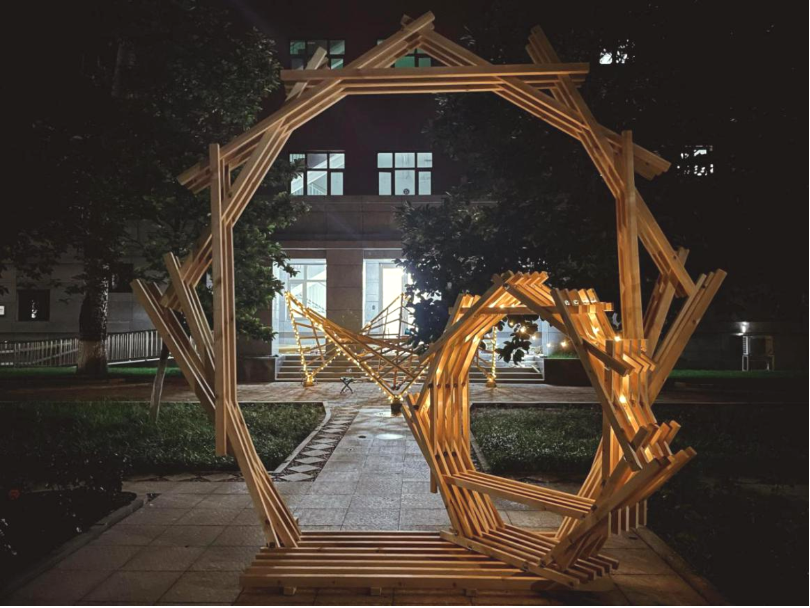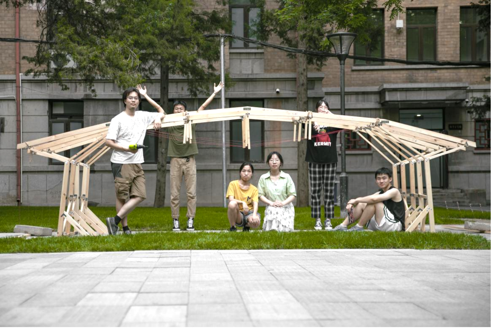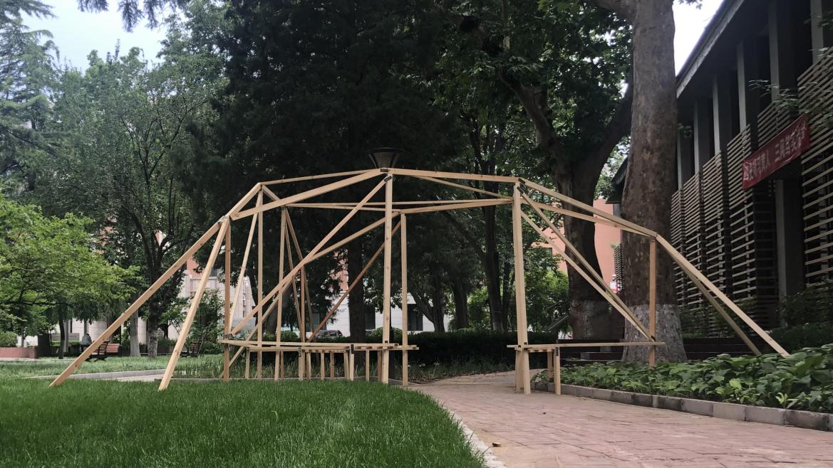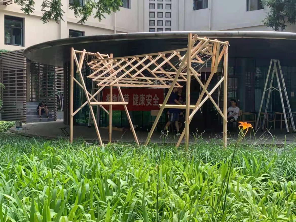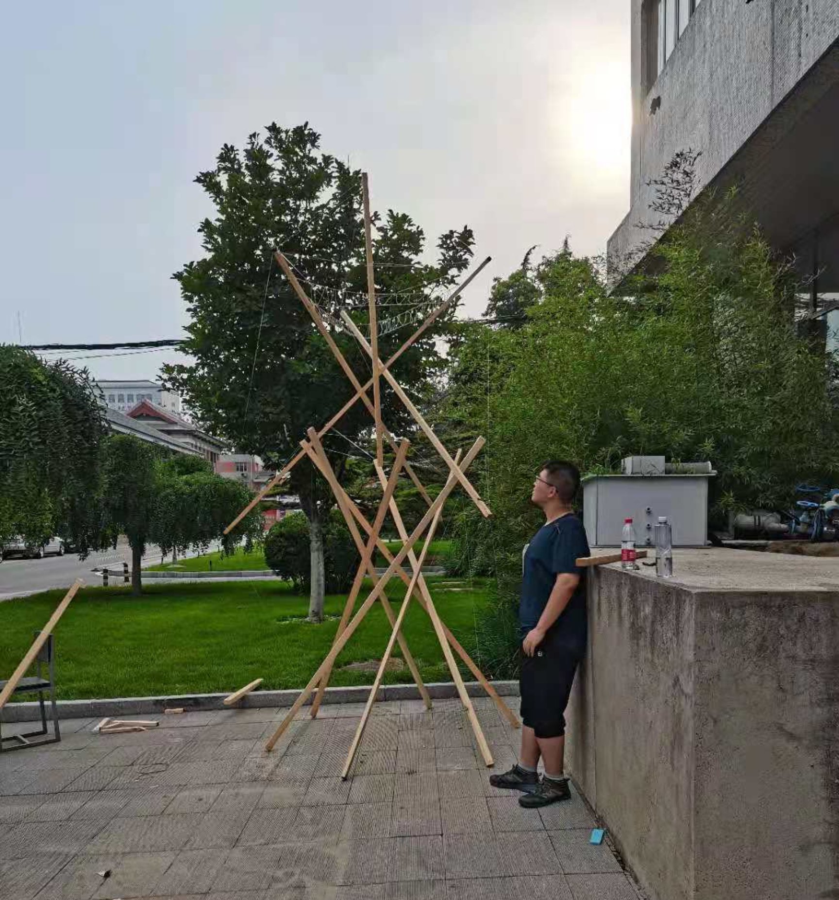 实习周具体实习任务为制作大尺度杆、曲面、组合结构模型,可以是高耸结构体系(要求占地≥1m2,高≥4m)或者大跨结构体系(要求占地≥5m2,跨度≥4m)。为保证教学质量,除本学院配备了团队外,还请来土木与交通工程学院的罗健老师及杜洪凯老师参与了指导与点评工作,从而使员工能够对作品有一个更加全方位的深入地认知。在一周的实习过程中,也的确验证了“实践出真知”的道理。个别组方案由于杆件长细比、材料本身性能或者节点处理不当等原因,在抗变形和承载力等上出现了一些问题。通过不断调整,当摇晃的作品坚固地立在校园时,员工在充分理解认可结构设计的重要性同时掌握了保证结构体系稳定性的一些技术措施,这些对于他们后续的学习帮助无疑是巨大的。