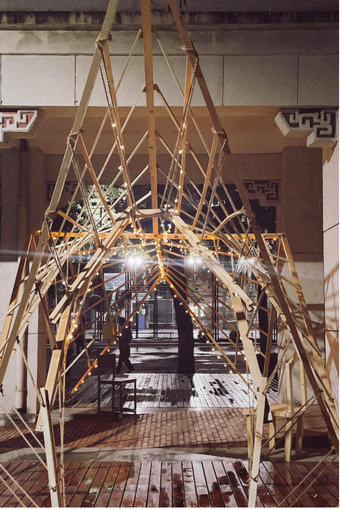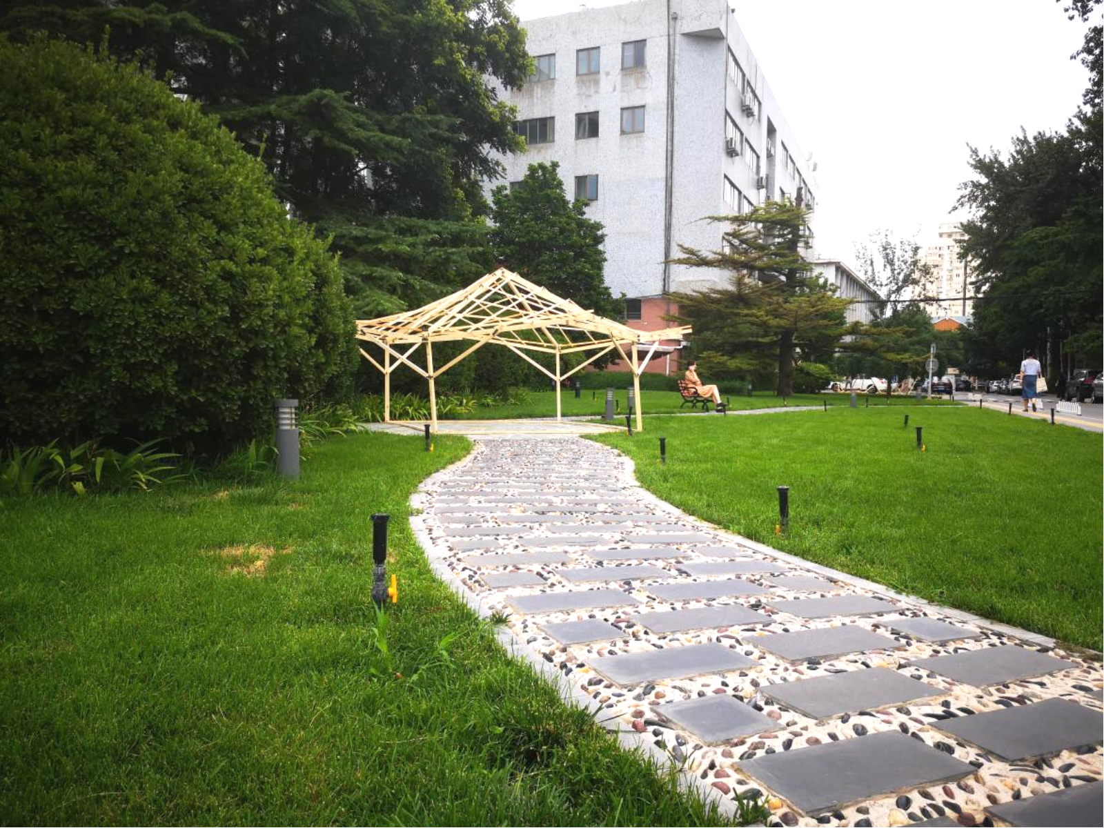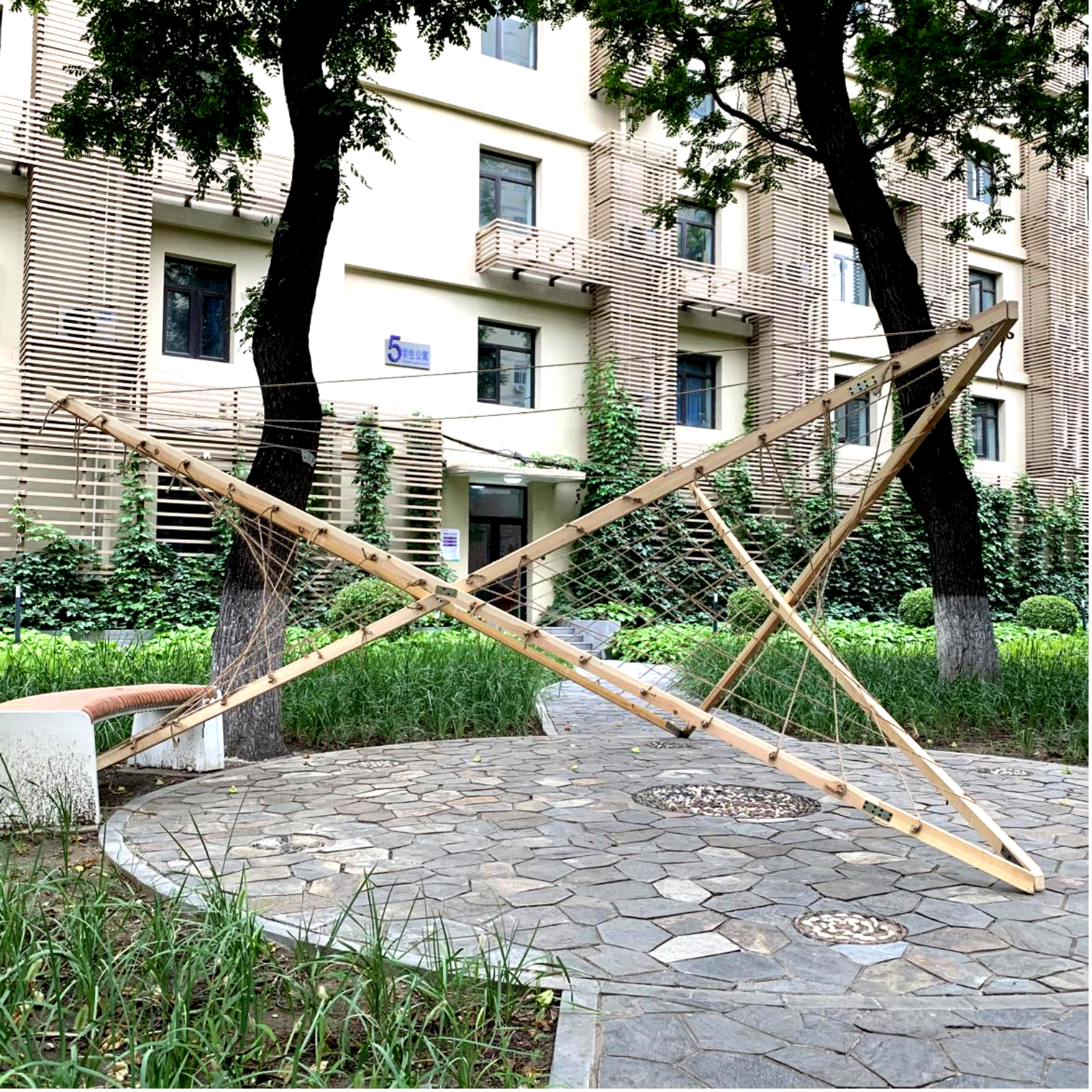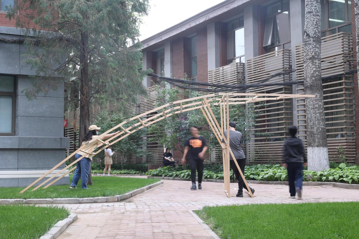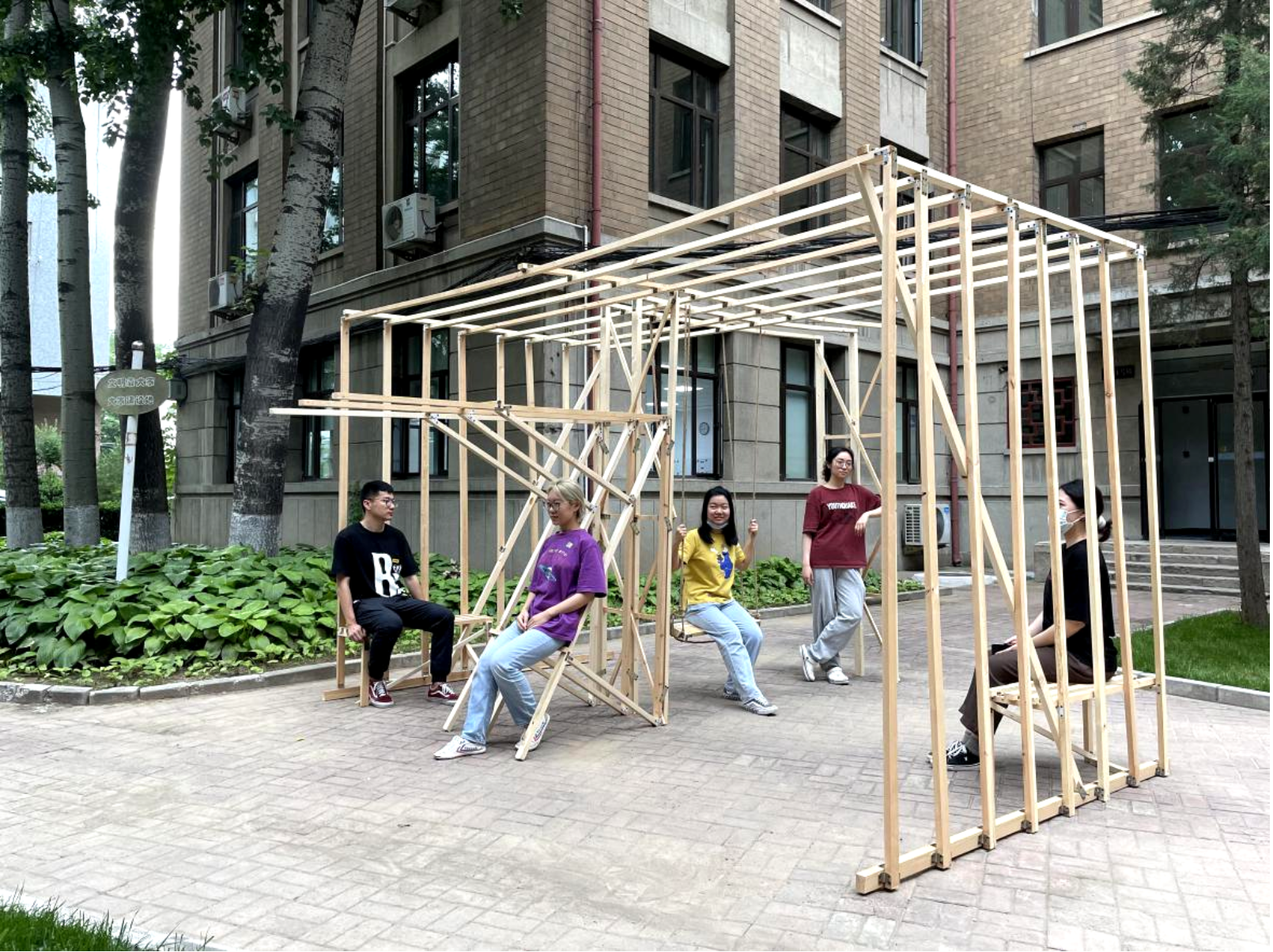 实习周具体实习任务为制作大尺度杆、曲面、组合结构模型,可以是高耸结构体系(要求占地≥1m2,高≥4m)或者大跨结构体系(要求占地≥5m2,跨度≥4m)。为保证教学质量,除本学院配备了团队外,还请来土木与交通工程学院的罗健老师及杜洪凯老师参与了指导与点评工作,从而使员工能够对作品有一个更加全方位的深入地认知。在一周的实习过程中,也的确验证了“实践出真知”的道理。个别组方案由于杆件长细比、材料本身性能或者节点处理不当等原因,在抗变形和承载力等上出现了一些问题。通过不断调整,当摇晃的作品坚固地立在校园时,员工在充分理解认可结构设计的重要性同时掌握了保证结构体系稳定性的一些技术措施,这些对于他们后续的学习帮助无疑是巨大的。