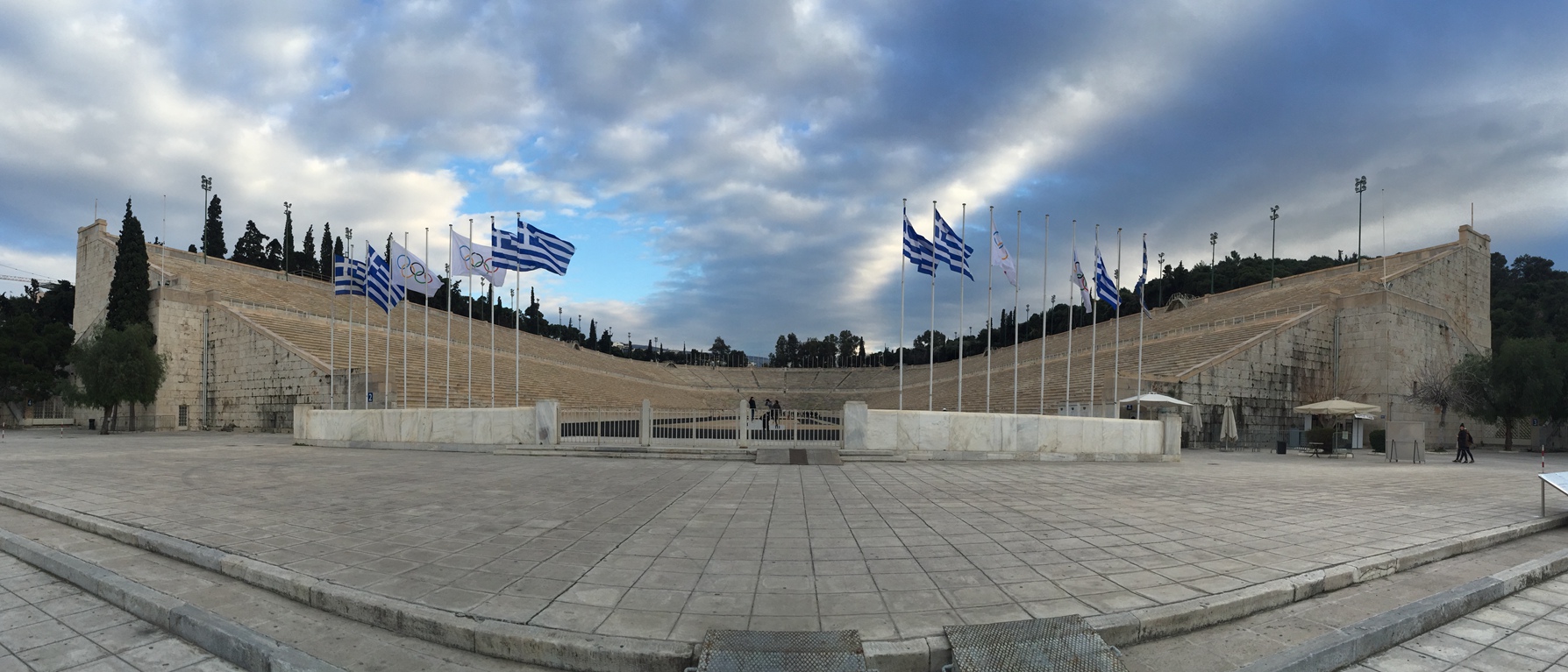 在离卫城不远处有一座著名的体育场,即帕纳辛纳科体育场,又名古大理石体育场,1896年第一届现代奥运会就在此举办。古希腊时期,这里经常举办泛雅典运动会,以此来纪念雅典娜女神。如今的体育场建于1895年,整座体育场呈“U”型设计,三面均为观众席,材质全部为大理石,半圆两侧的观众席长达百米,数十层高的观众席进一步渲染了体育场的宏大,真正身处其中时,似乎依稀可以想象到4万余名观众欢呼的场景。经过一百余年的风雨洗礼,体育场的型制基本保持了原有的风貌,依旧使用黄土地作为比赛跑道,观众席仍没有安置护栏,整条的大理石作为座椅。