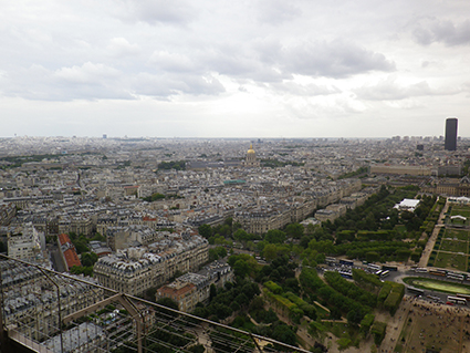 乘坐电梯登上埃菲尔铁塔的观景台,巴黎城尽收眼底。这座渗透着百年古老气息的城市的沉静和安详令人敬由心生却无从表达。温带海洋气候的温柔水汽凝成的灰厚的云层遮住天空,不远不近地笼罩在静静沉睡的古老巴黎上空。北面夏洛宫双臂环绕一般拥抱着中心莹莹如镜的大喷泉池,南面战神校场宽阔的草坪,法兰西军校的古老建筑,静静流过的塞纳河水是这段漫长的百年时光不动声色的静谧呼吸。在一片片鳞次栉比中隐约能找到巴黎圣母院,蓬皮杜艺术中心,卢浮宫等著名建筑。不似帝都的宽广对称,长驱直入,横平竖直,巴黎的街道曲曲折折,向各个方向斜着分支,伸展,却依然不失和谐与美。极目远眺能看见远在天际的蒙马特高地和上面明珠一般洁白的圣心大教堂。