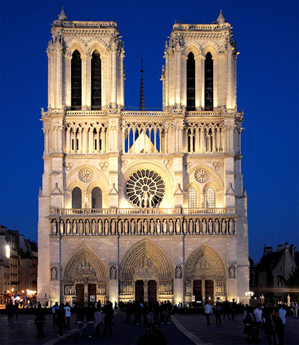 雨果在小说里描写巴黎圣母院道:“正面那三道尖顶拱门,那镂刻着二十八座列王雕像神龛的锯齿状束带层,那正中巨大的花瓣格子窗户,两侧有两扇犹如助祭和副助祭站在祭师两旁的侧窗,那用秀丽小圆柱支撑着厚重平台的又高又削的梅花拱廊,还有两座巍巍、黝黝的钟楼,石板的前檐,上下共六大层,都是那雄伟壮丽整体中的和谐部分,所有这一切,连同强有力依附于这肃穆庄严整体的那无数浮雕、雕塑、镂錾细部,都相继而又同时地,成群而又有条不紊地展现在眼前。可以说,它是一曲用石头谱写成的波澜壮阔的交响乐;是一个人和一个民族的巨大杰作,其整体既复杂又统一,俨如它的姐妹《伊利亚特》和《罗芒斯洛》;是一个时代的一切力量通力合作的非凡产物,每块石头上都可以看到在天才艺术家熏陶下,那些训练有素的工匠迸发出来的百般奇思妙想。”