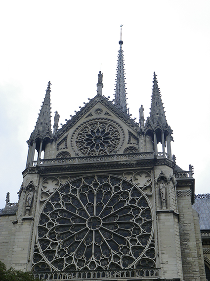 这是一座笼罩着神秘宗教色彩的典型哥特式建筑。石头上精巧令人目眩的镂空减轻其骨架的重量,无比精致的雕花使教堂显得玲珑剔透却又瘦削冷峻。建筑上分布的无数有关宗教故事的雕塑又使它显得神圣庄严。圣母院的平面呈横翼较短的十字型。底部的三个桃形门洞上布满了中世纪时期完成的塑像和雕刻品。中央的拱门上雕刻的是耶稣在天庭的最后审判。拱门上方的众王廊上陈列着旧约时期二十八位君王的雕像。最中间的直径约为十米的巨大玻璃窗就是巴黎圣母院极其著名的玫瑰花窗,上面绘制着神职人员传教用的圣经故事。中央的塑像是圣母圣婴,两旁分别是亚当和夏娃的塑像。