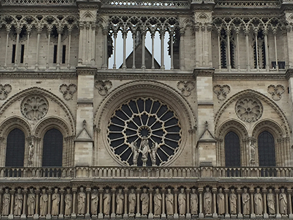 众王廊,圣母圣婴雕像和雕像背后的玫瑰花窗