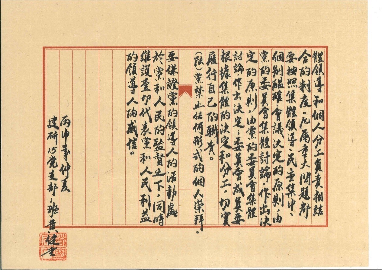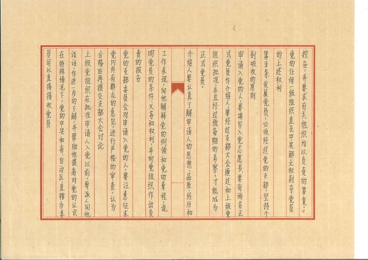 公司党员理论学习与实践活动,一贯秉承将专业特色融入党建活动中的思路,让员工党员以专业为带动,调动员工党员参加组织生活的积极性,激发广大党员同学学理论、用理论的热情,本次党章学习活动主要以员工党员抄写党章的形式展开,以员工党支部为单位,协调各支部党员人数,每名员工党员进行600字左右的党章抄写,形式以专业学习中的工程字、软笔字为主。该项活动历时三周,员工党员挑选出较为整齐美观的手抄党章,在支部内进行交流学习,并最终挑选部分作品装订成册,在学院内进行交流展示。