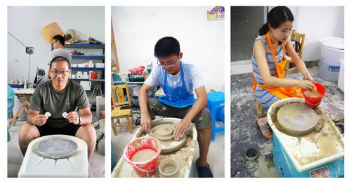 21日下午,实践团成员来到窑厂学习陶瓷手工拉胚技艺,亲身体验瓷器手工制作的魅力。拉坯是传统手工制瓷七十二道工序之一,是器物成型的雏形阶段。实践团成员在师傅的教导下,细心琢磨技法,反复尝试。在逐渐掌握拉胚关键技术步骤后,实践团部分成员身体力行、勇于创新,在拉胚制作简单器物的过程中融入建筑元素,作品给人耳目一新的感觉。