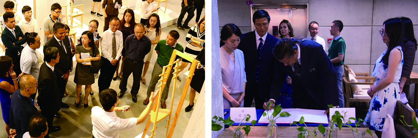 展览开幕式结束后,与会人员共同参观了展览。领导、嘉宾欣然在威廉希尔体育关于传统家具技艺、传统木雕技艺学术出版物上赠言题字,与作品设计师生进行了交流和探讨。