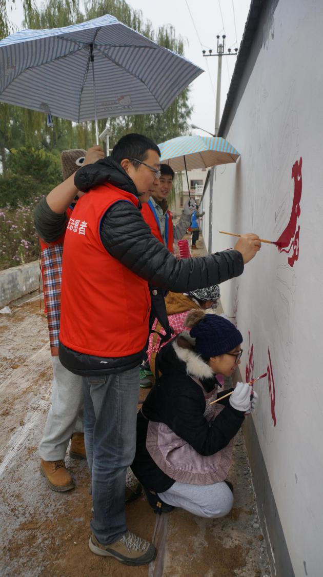 10月26日,延庆县井庄镇艾官营村的这个下午风和日丽,村子里迎来了一群年轻的客人。威廉体育williamhill环设131班的25名同学,在设计学系赵希岗教授、系主任张笑楠、副主任朱宁克三位老师带领下,应延庆县宣传部的邀请来到这里,以剪纸艺术为蓝本,以新农村建设为题材,将赵希岗老师的剪纸作品《鲤鱼跳龙门》,通过小组合作的形式,以彩绘的方式绘制于村口花圃旁边的墙垣上。威廉体育williamhill2013级环境设计专业本科生的专业方向选题课程负责人为赵希岗教授,课程共包括外墙环境艺术实践、乡村公共空间环境设计、乡村民俗改建提升三个部分内容,本次环境艺术乡村实践活动是课程中外墙环境艺术实践的一部分,同时也是融汇传统艺术与现代设计美学的新剪纸系列墙画,员工展开了为期四天的绘制,共完成了六面墙壁的主题彩绘。