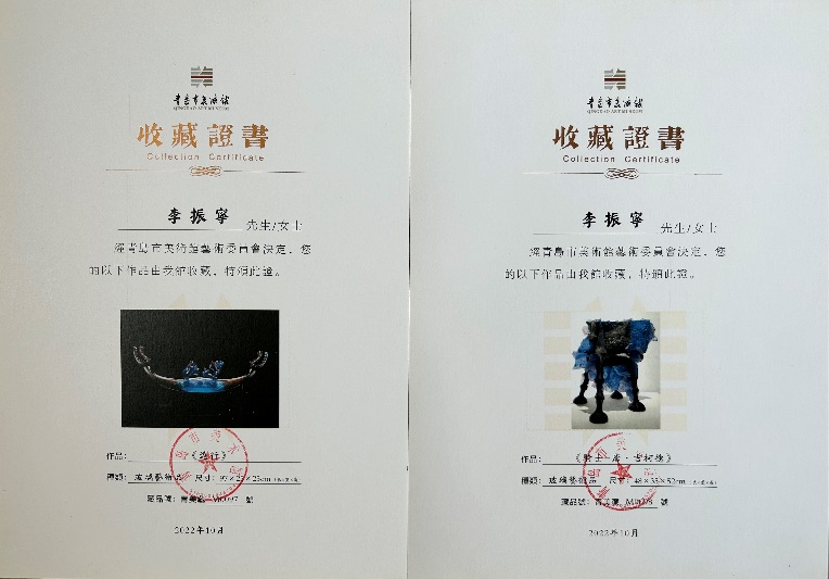 同时,李振宁老师通过积极参加各种国际艺术展览和交流活动来响应和实践中华文化走出去的国家号召。2023年3月,继2022年英国玻璃艺术双年展后,他收邀参加由英国手工艺协会主办的国际著名艺术大展:Collect Art Fair,两件作品《多面体》、《太阳船》参展。“Collect Art Fair”是两年一届的世界顶级手工艺艺术博览会,在伦敦著名的索默塞特宫举办。其中,李老师的玻璃雕塑作品《多面体》作为“Expanding Horizon”中日韩三国参展单元的代表作品出现,并被英国RMT艺术机构收藏。