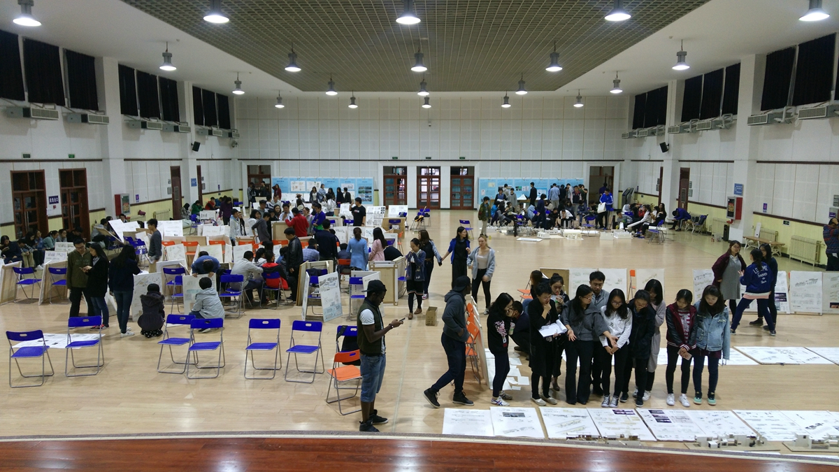 但是对建筑设计课程来说,一是我国原有的建筑设计教育长期以来多侧重建筑功能布局与形式美学的推敲,对建筑的实际工程建造和社会需求关注不足;二是建筑设计教育的教学组织通常是侧重高年级设计课的校外建筑师评图、多校联合毕业设计、设计院实习等环节,对低年级设计教学的工程性、建造性和社会性重视不足;三是公司西城评图空间比较紧张,没有大型的多班级多年级联合评图的公共空间,因此原先的多采用的各班班内评图或少量班级合班评图的情况并不能充分地实现评图在设计教学中的重要作用。因此,本次评图进行了三大方面的改革:一,申请启用老员工活动中心大空间开展九班联合评图,实现九个班级作业“共评”;二,评图的过程也是图纸和模型甚至师生交流情境的展示过程,促成多课题多专业作业“共展”;三,邀请社会上的资深从业建筑师参与设计教学与评图,促成教师之间、师生之间、同学之间的“共融”。