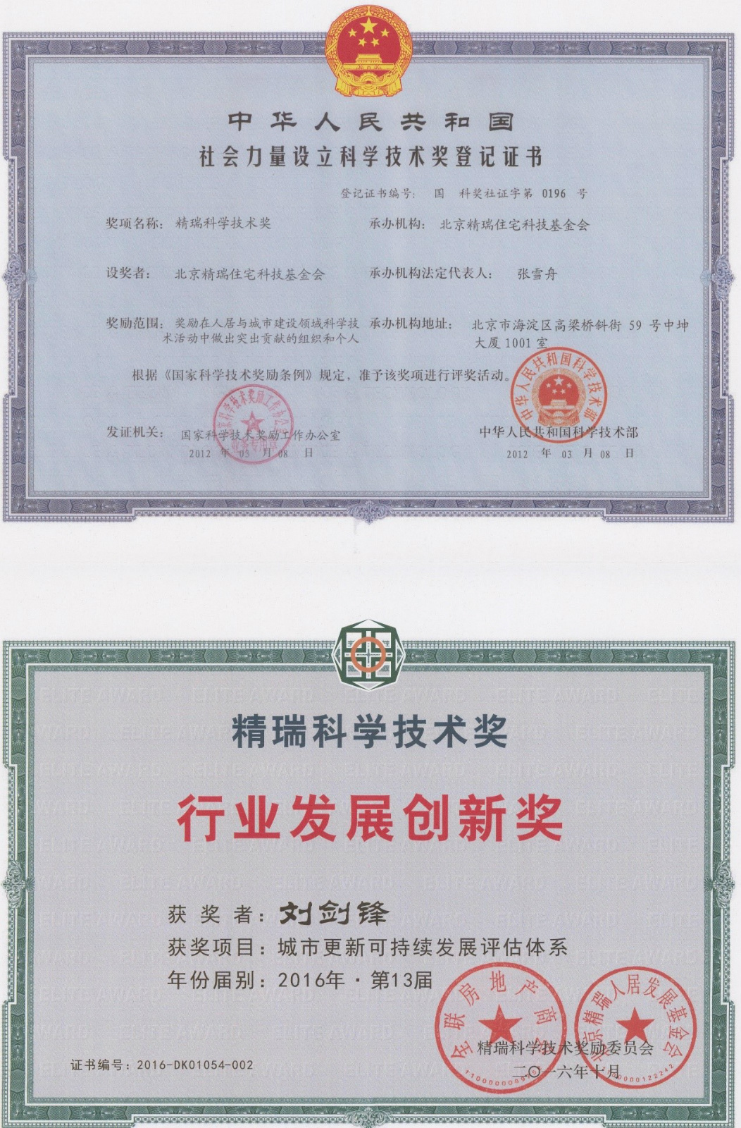 2016年10月19日,第13届精瑞科学技术奖颁奖典礼在北京富力万丽酒店隆重举行,公司刘剑锋副教授与中国建筑设计院有限公司、浙江农林大学共同参评的科技成果“城市更新可持续发展评估体系”荣获“行业发展创新奖”。