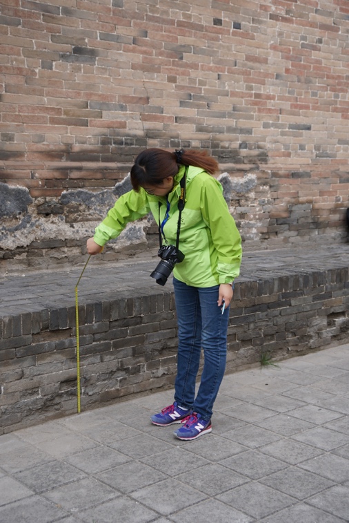 图10.徐婷测量台基 图11.曹雪利、宋耀华讨论翼角做法