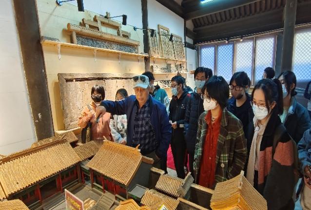 随后,师生们共同前往清华寺,这里是京诚集团工匠营所在地,同学们听取了老匠人刘老师的讲解,进行参观并举行了交流座谈会。在参观中,同学们了解了传统屋顶 “棋盘心”、“干槎瓦”等工艺作法、,并实地观摩古建筑修缮、榫卯和木窗制作等环节。