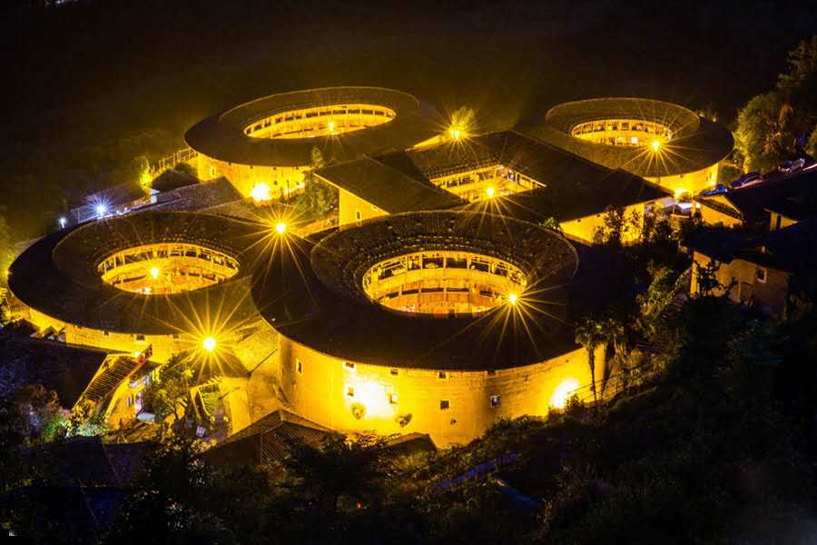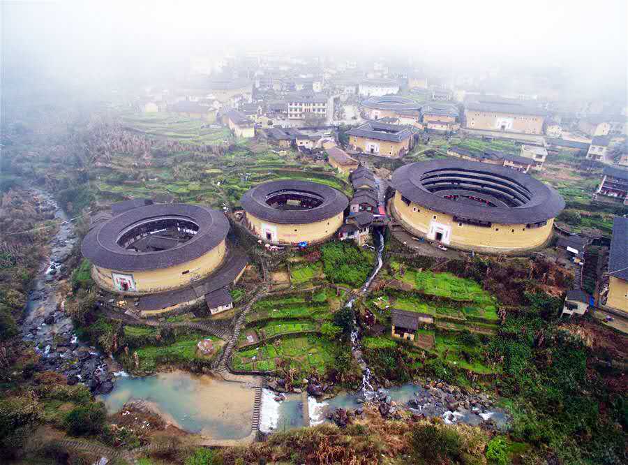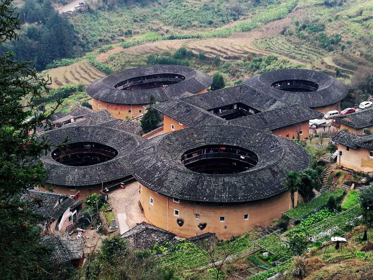 如果说鼓浪屿是厦门现代建筑的明珠,那么福建古老的原生建筑就数闽南的土楼了。土楼是畲族的传统民居,一个家族建一个围合成圆形或者方形院落,中央是天井。外墙是黄土夯筑,三到四层,非常坚固,只留一个小的外门,以防土匪盗贼。各户竖向划分,面向天井。我们驱车百余公里来到南靖县,参观典型的土楼建筑——“四菜一汤”。一般土楼独立而建,而这个“四菜一汤”却是四座圆土楼围绕着一座方土楼,形成组合土楼建筑。这真是古代建筑师的杰作。这些土楼的外墙上都留下许多弹孔,可以想象当年与盗贼枪战是何等激烈。