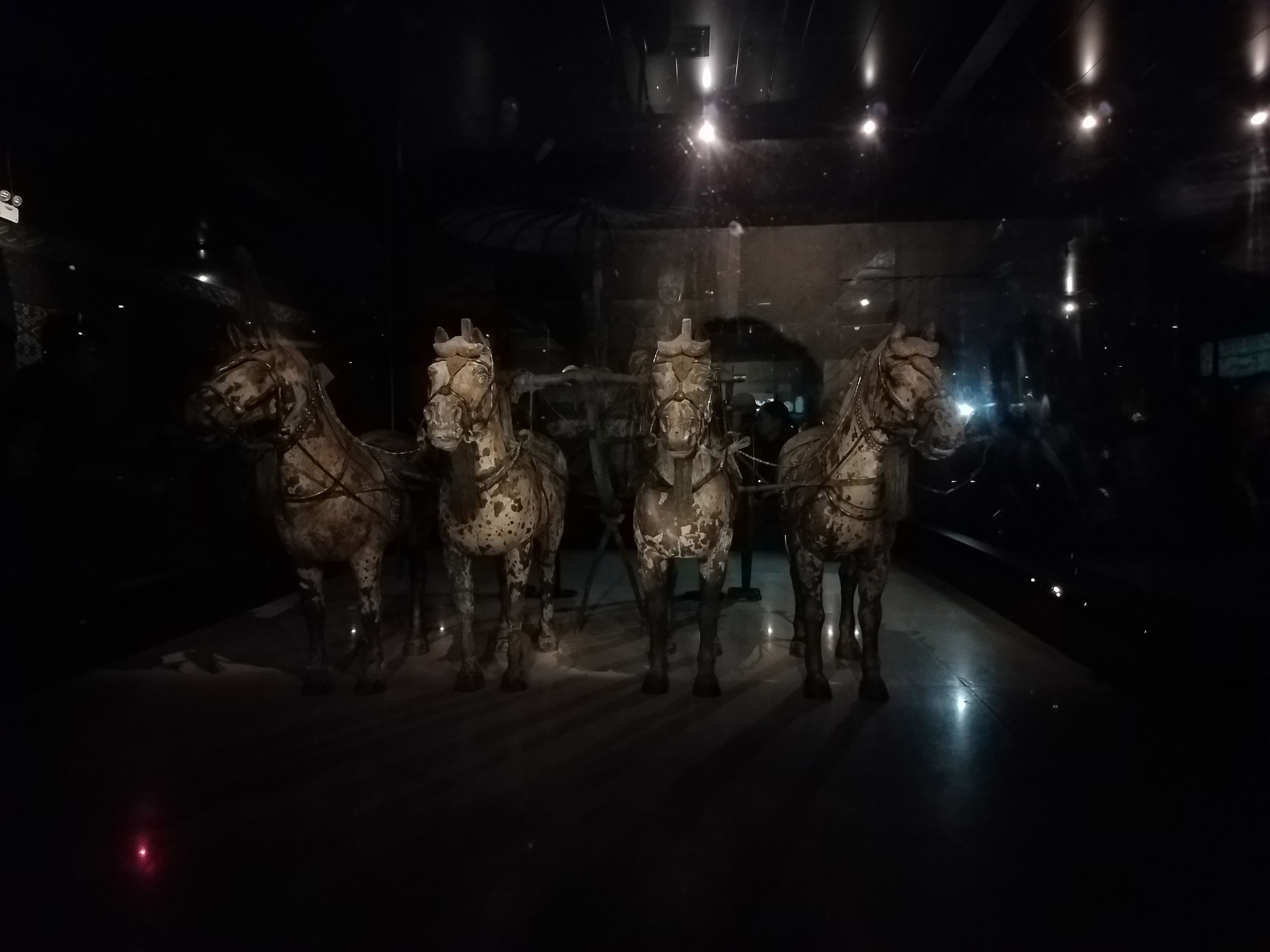 其实除了一二三号坑外,还有一个四号坑,只是四号坑里没有一件陶俑,是一个空坑。据专家推测,四号坑未及建成,秦已灭亡了,所以只留下一个空坑,也给后人留下了无穷的遐想。参观秦俑,当然不能错过被誉为"青铜之冠"的铜车马。我们拾级而下,进入秦俑文物展厅,厅内人头攒动,围绕着两辆二分之一实物大小的铜车马,惊叹声,快门闪动声不绝于耳。是啊,当两千多年前皇帝的架车再现你的眼前,你除了赞叹,还能说出什么呢?大到车盖,架俑,小到酒壶,箭,弩,乃至车上的纹饰,都纤毫毕现,每辆车的右骖马头上都有纛,表明这是皇家专用,车上的一面龙纹盾,更是首次发现的秦盾实物。一号立车上的伞盖支撑也是暗藏子母连环扣,可以根据太阳的方位不同而加以调节伞盖的方位,便于遮阳挡雨。二号安车内可供坐卧,门在车的后部,左右都有车窗,车窗装有挡板,可以从里向外观察,而外面则很难看到车内的情景。整个铜车马由数千个零件构成,不仅有青铜,还有金。银制件,真是古代冶金铸造上的奇迹。有些工艺两千多年前的古人是如何完成的?至今还不得而知。从兵马俑出来,我们路过秦始皇陵,高大的封土堆经过两千多年风雨的侵蚀和人为的破坏,已经降低了不少。秦人最杰出的智慧之果就埋藏于封土之下的地下宫殿中,在那里,可能藏着很多谜底。