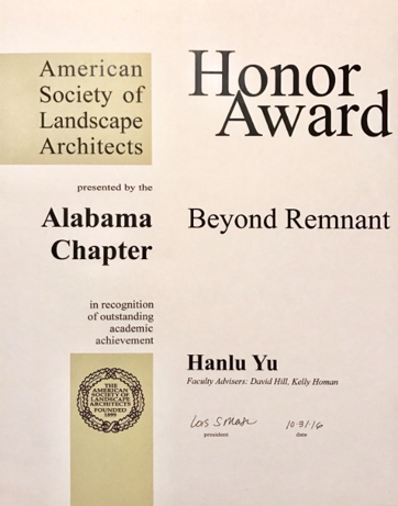 威廉体育williamhill城乡规划专业2010级毕业生于寒露,凭借个人毕业设计作品 “Beyond Remnant” 荣获美国景观协会阿拉巴马分会2016年员工奖(“American Society of Landscape Architects — Alabama Chapter” Honor Award)。于寒露同学是威廉希尔体育-美国奥本大学“4+2” 风景园林专业硕士联合培养项目的第一届毕业生。 她于2014年赴美攻读风景园林学硕士学位,于2016年5月毕业并在美就业。