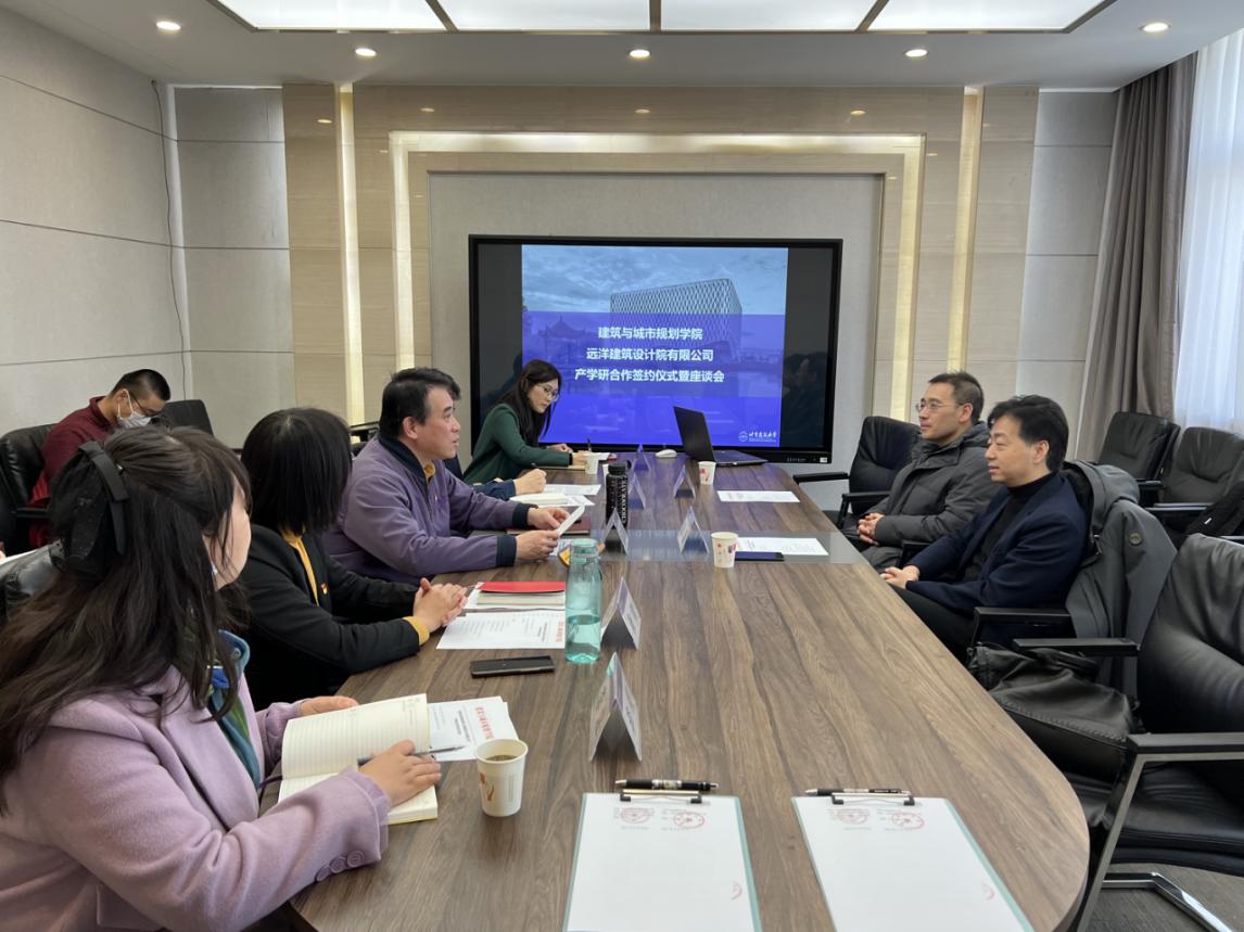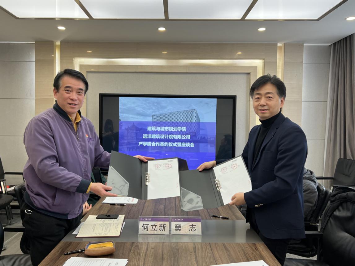 威廉体育williamhill与远洋建筑设计院有限公司达成初步合作意向,窦志和何立新分别代表双方签署产学研合作框架协议书。