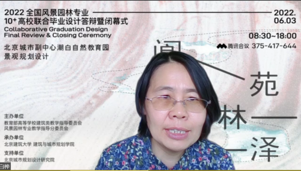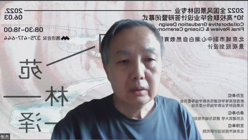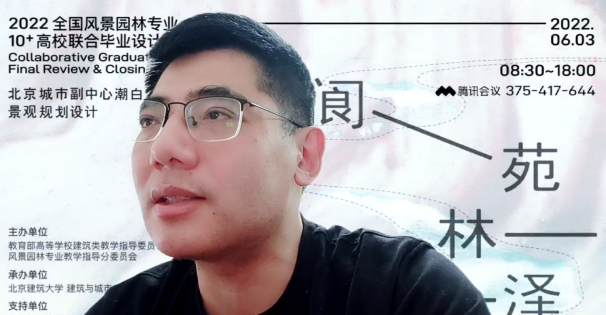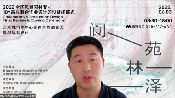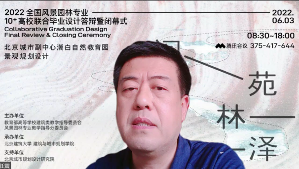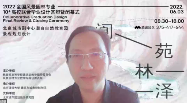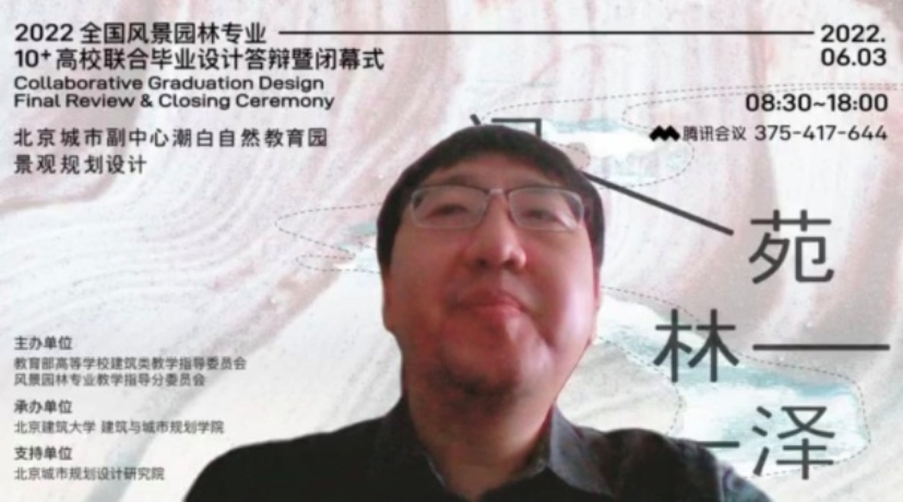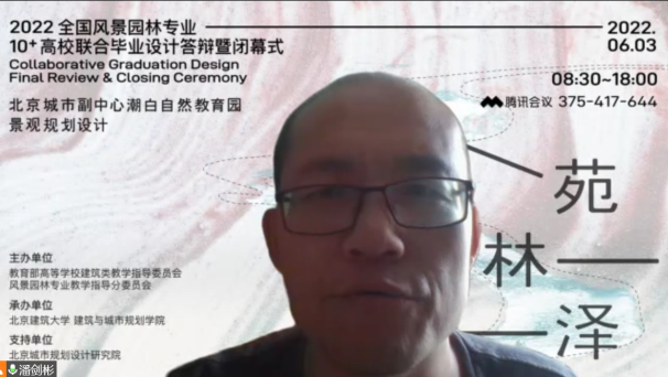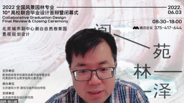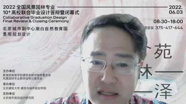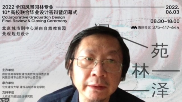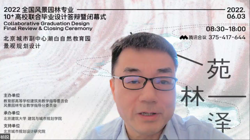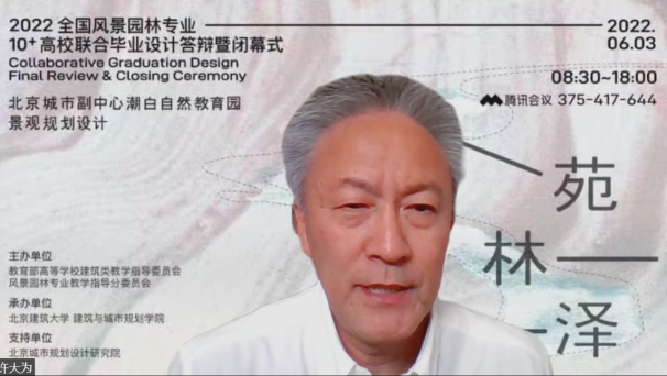 风景园林教指委主任杨锐教授在致辞中首先肯定了本次联合毕业设计的选题,前两年选题分别聚焦于北京天坛“三南”外坛及古北口长城区域,在城市更新及文化遗产保护工作中展现了风景园林专业的责任和担当。本年度选题聚焦于北京城市副中心的潮白自然教育园,这一选题在如今建设新时代生态文明的背景下,能够最好的展现风景园林人才的能力和智慧。期待参与本次联合毕业设计终期答辩的10+高校都能展示出多样性的视角及思路,积极主动地承担时代赋予的社会责任与使命。