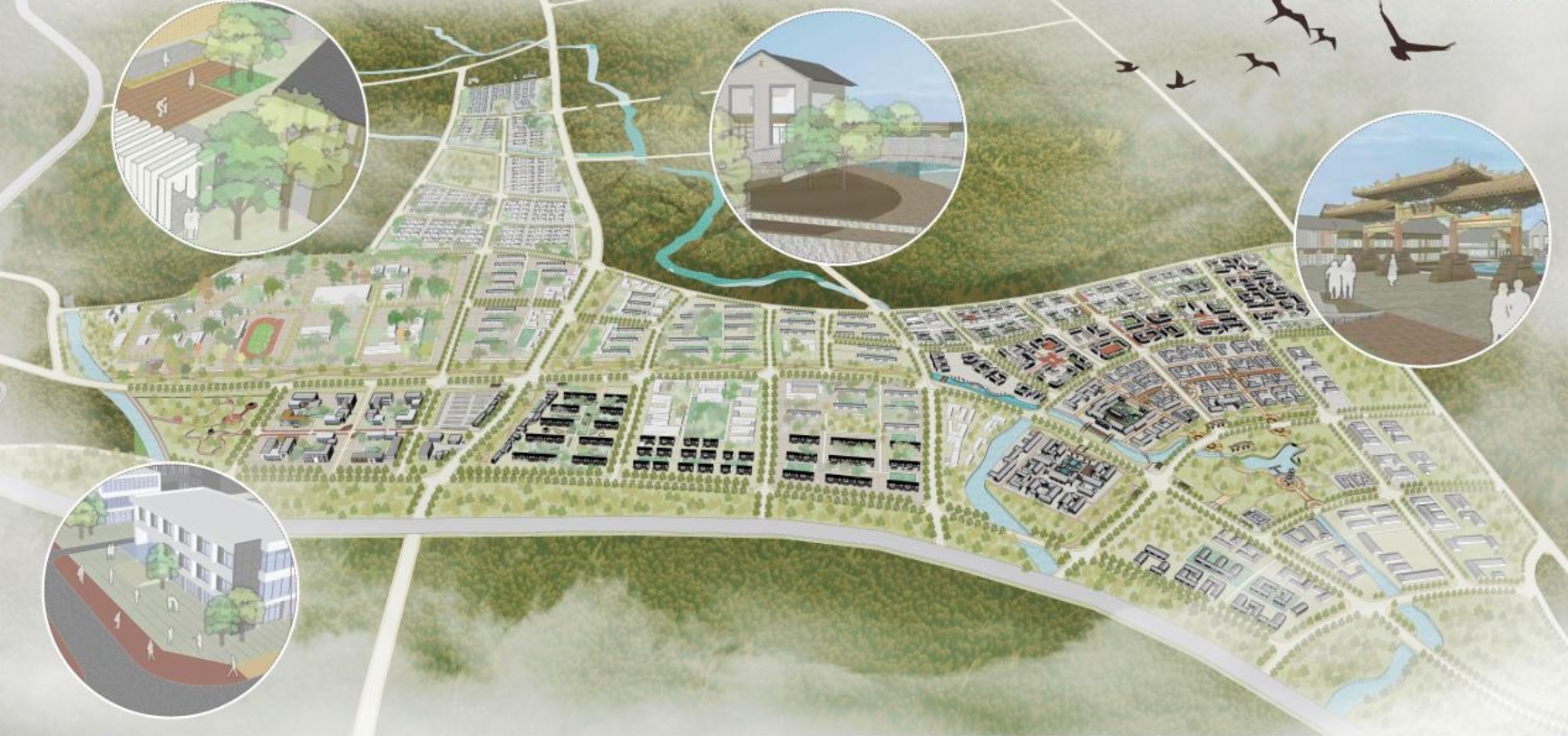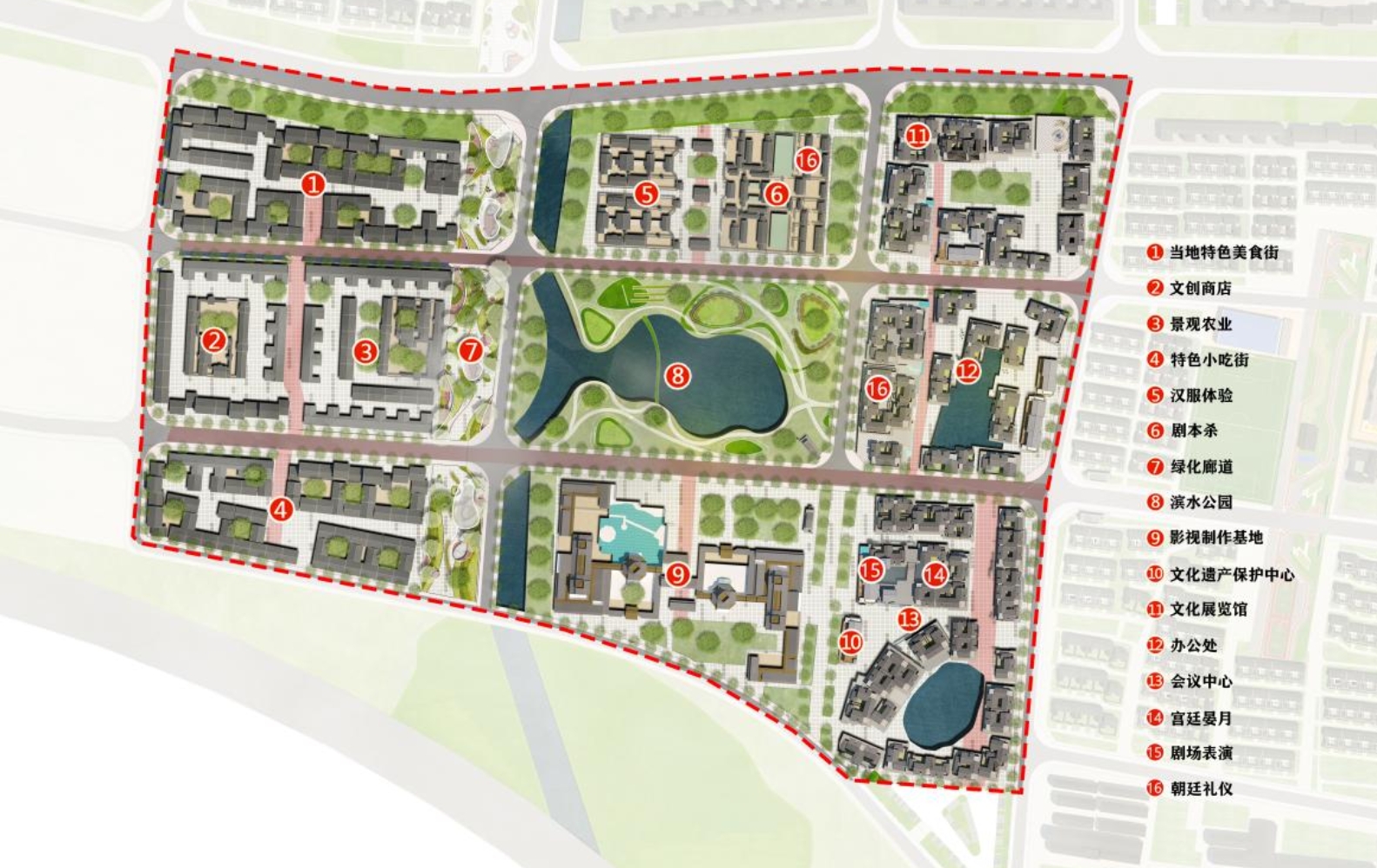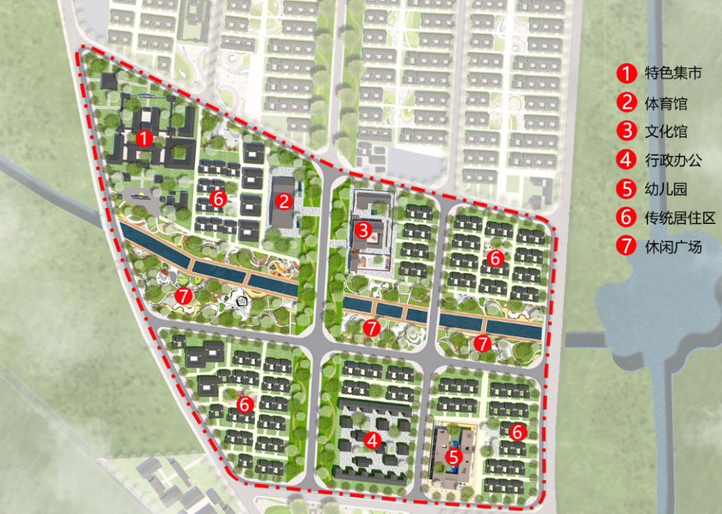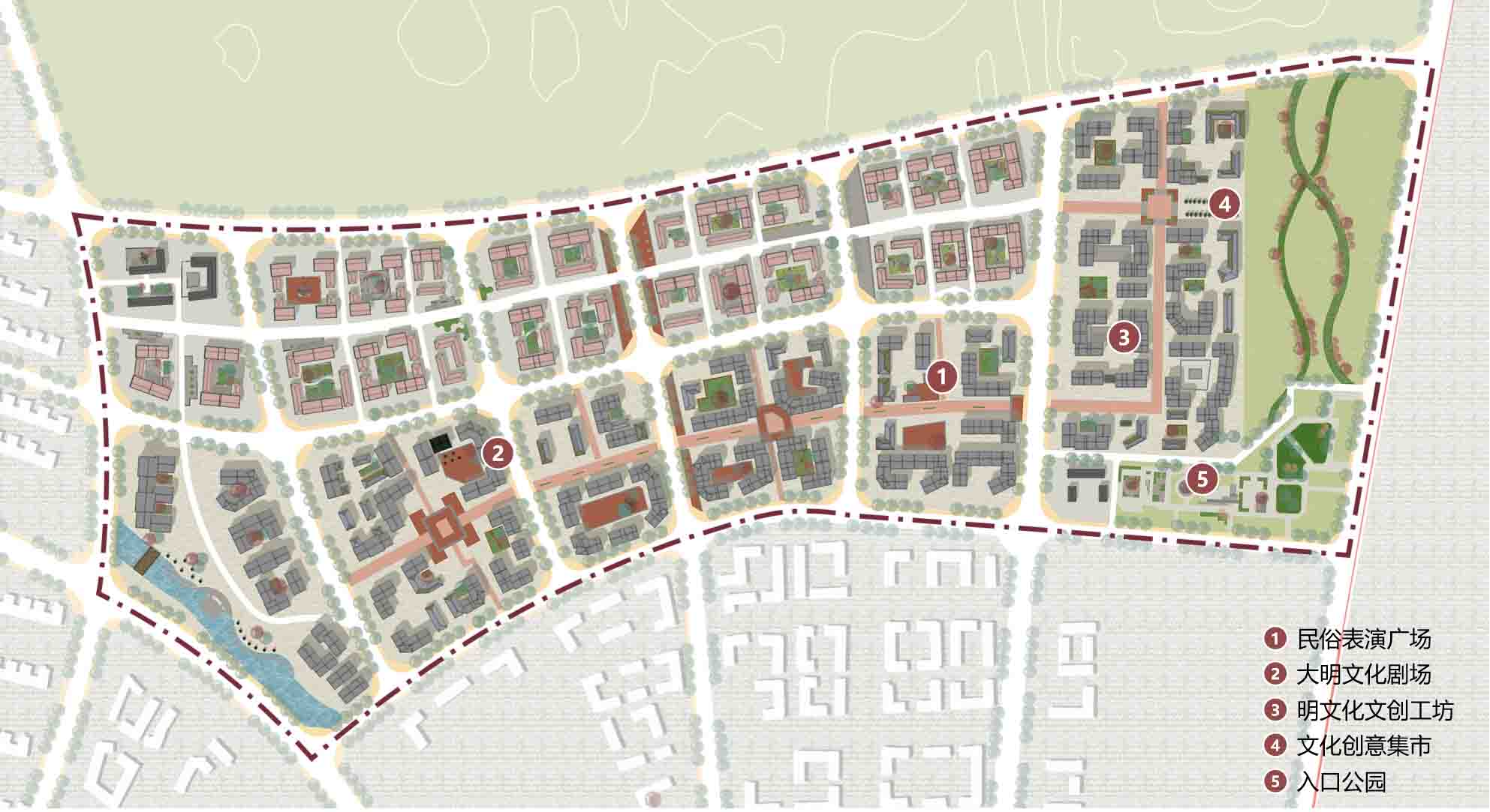 传统风貌住宅区区主要通过明文化叙事和悠闲旅游文化叙事两条线路展开,用地面积:20.26公顷,将明文化要素融入景观设计,通过景观小品、广场和栈道等来展现明文化,营造更加浓厚的传统文化氛围。通过滨水廊道和绿色廊道两大景观向街区内部渗透的方式和片区绿心的设计,来提高街区整体绿地覆盖率,提升居住区的环境品质。