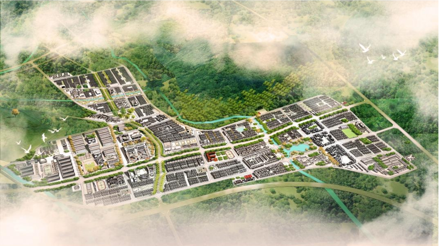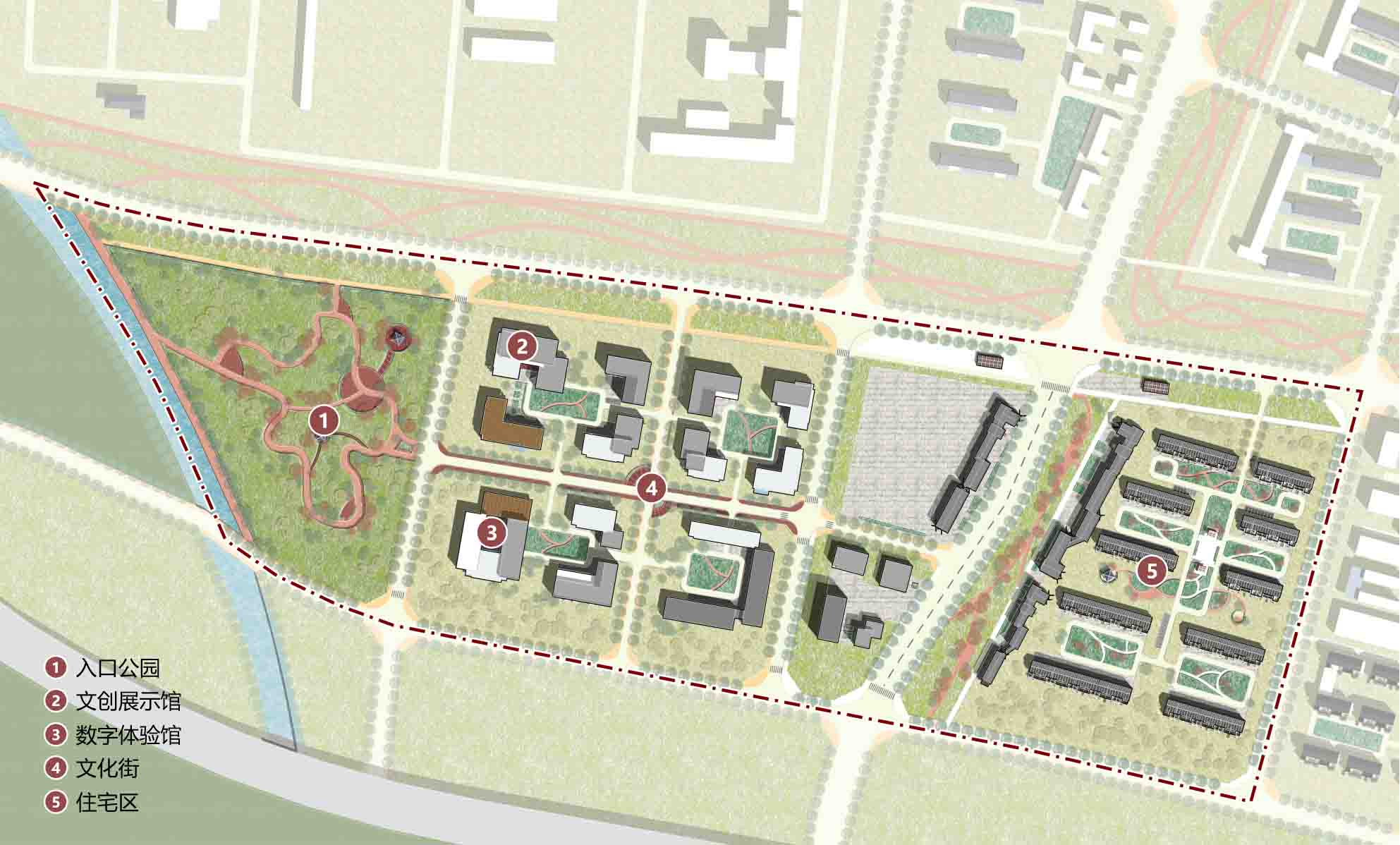 地块为方案的核心地段,主要承载休闲旅游、文化展示、餐饮购物、学术研究等,用地面积:33.14公顷,在此节点设计中主要考虑地块内不同文化功能片区的组合搭配,辅以景观设计,最大程度的体现体现生态底蕴,以及山水格局,设计中尽可能保留原有的积极元素,集商业、娱乐、文化体验、商务办公等多种功能为一体。