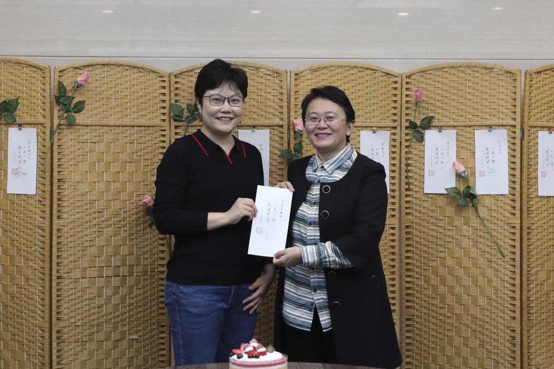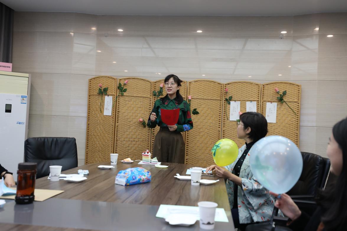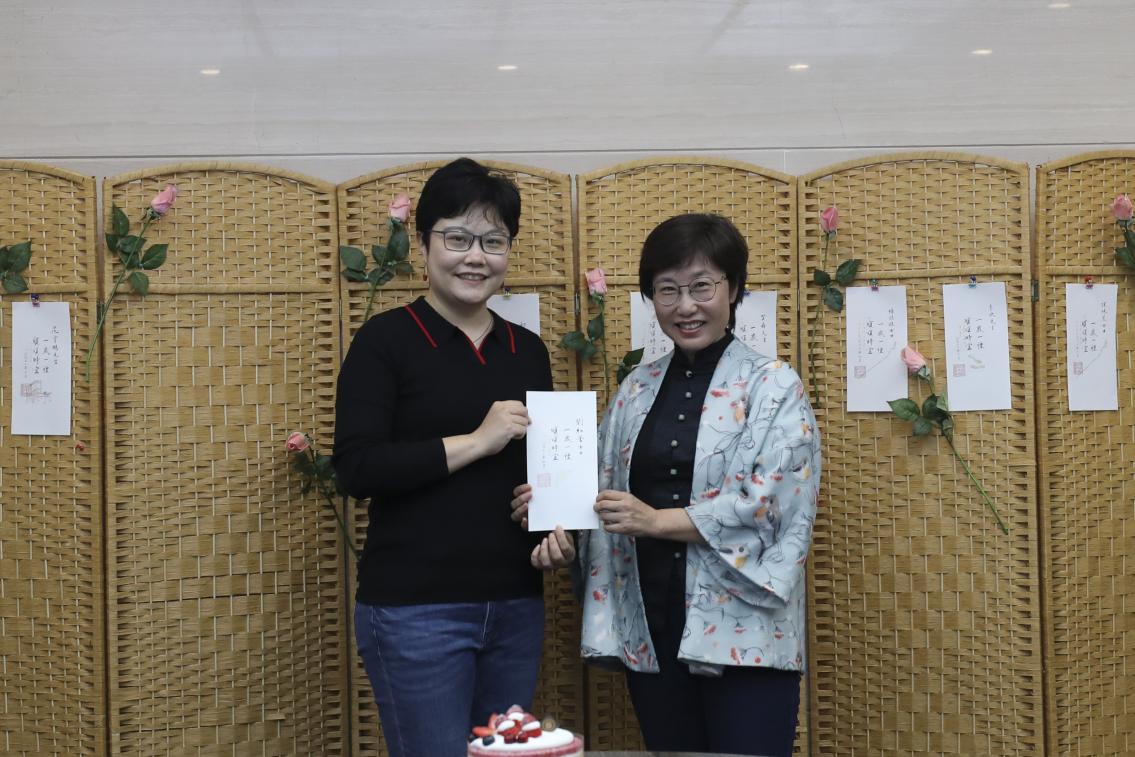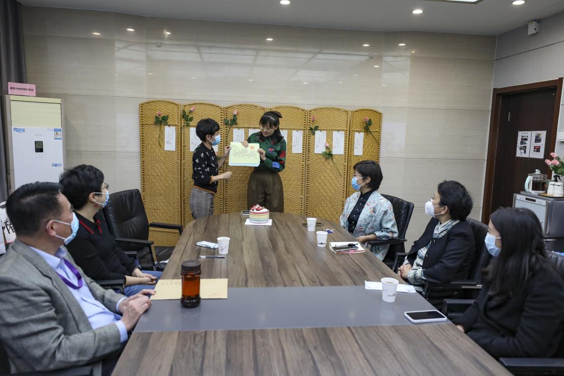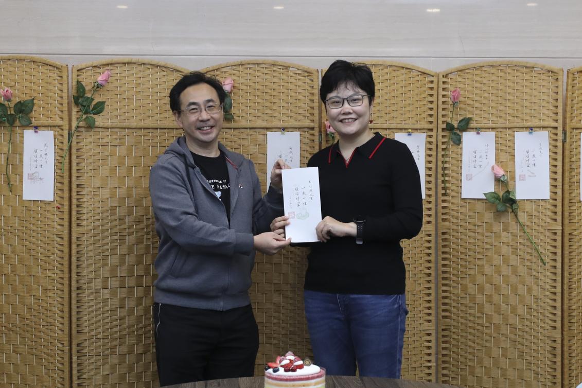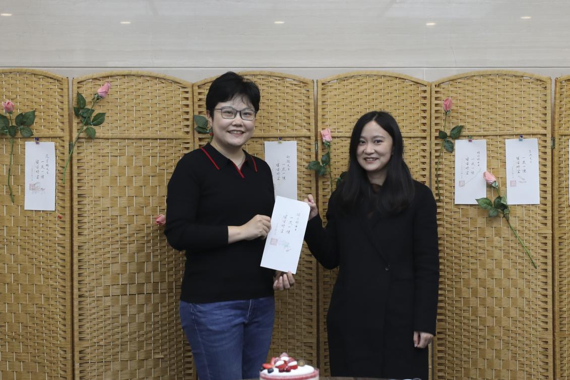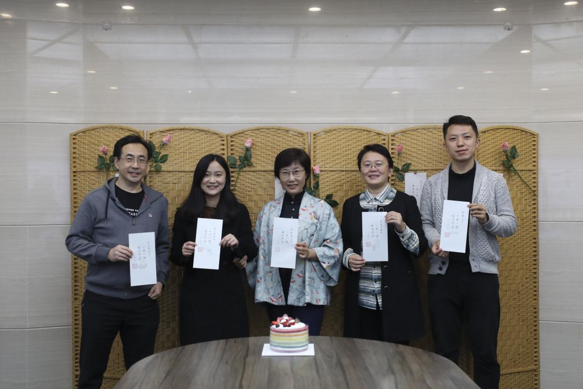 梁佳老师担任此次生日会的颁卡嘉宾。伴随着悠扬的《生日歌》旋律,梁老师走上台来,为老师们一一送出贺卡并送上祝福。特别要说明的是,生日贺卡所用纸张是由何立新老师挑选的清秘阁笺纸,其上书法“一岁一礼、顺颂时宜”由学院退休教师李沙教授亲笔书写,落款的学院印章则由杨振老师精心刻制。卡片虽小存大爱,设计入微运匠心。集体生日会的生日贺卡受到老师们的一致好评,大家纷纷表示,想集齐10张、20张、30张,珍藏来自学院的美好祝愿。