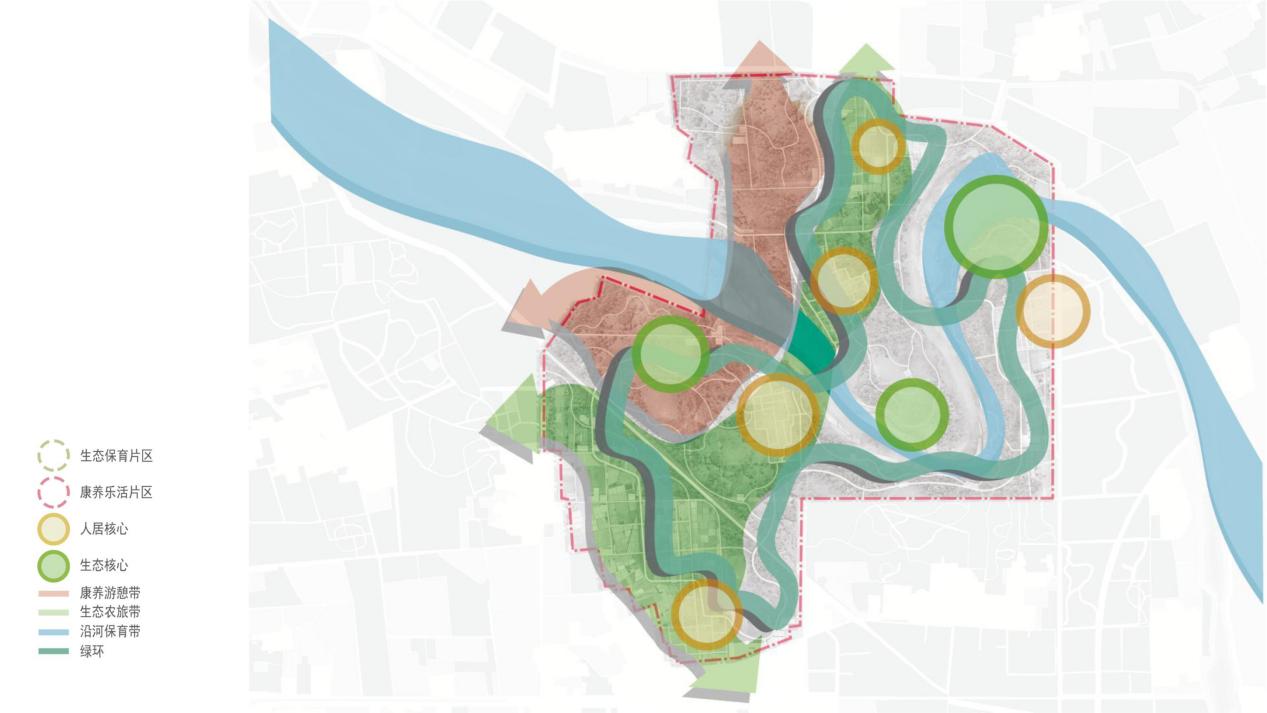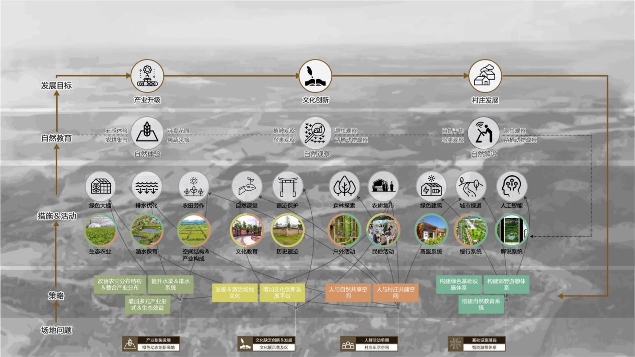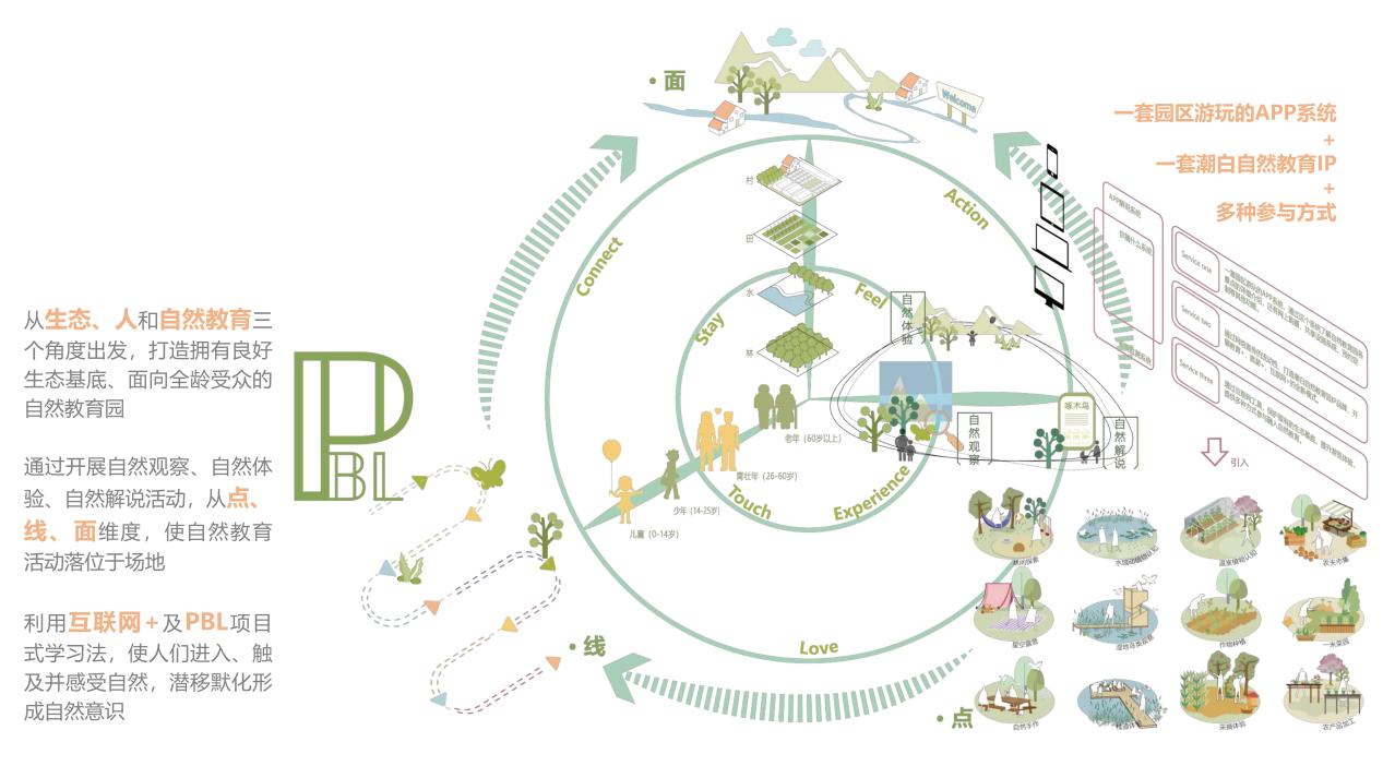 村庄节点我们以自然风光、传统民俗、节庆活动为特色,形成多点环绕的公共绿色开放空间。与场地内学校携手打造全龄自然教育课程,并将自然教育体系、康养体系、雨洪处理体系与场地紧密结合。